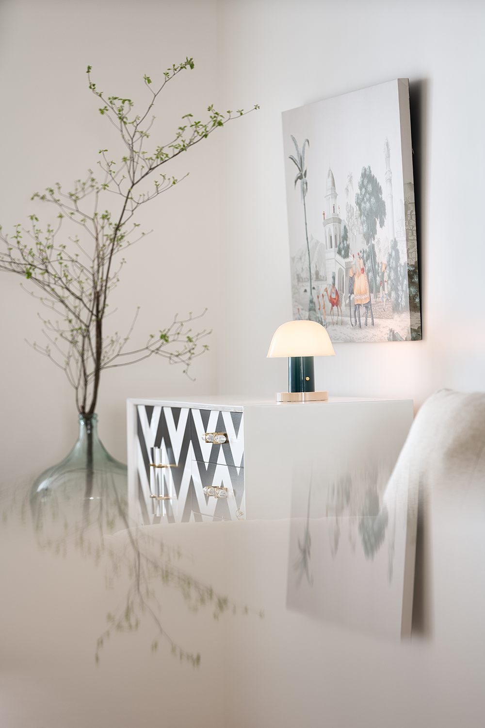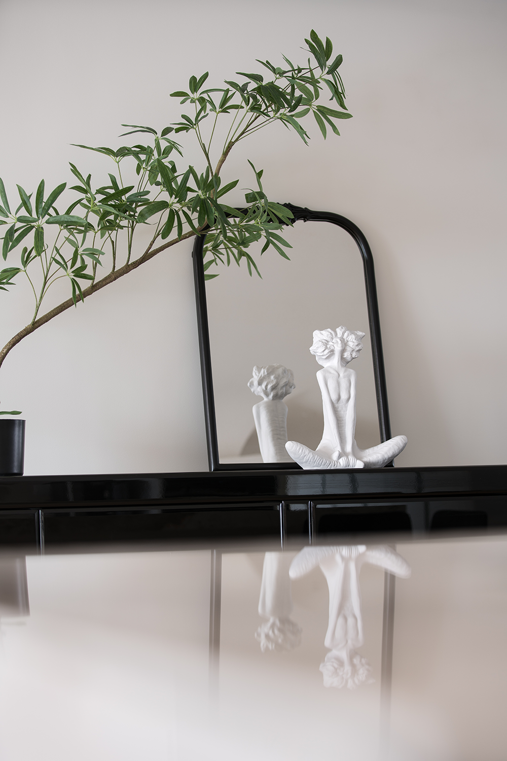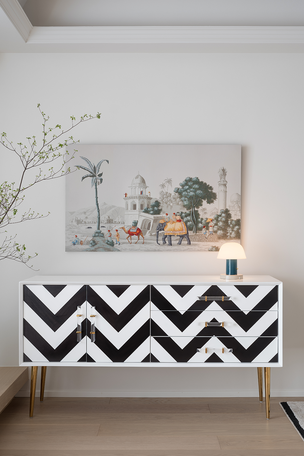 黑白极简几何感的艺术玄关柜、搭配艺术装置画、个性艺术品,丰富了空间的延伸感与想象力。自然质感的选材蕴含着深层次的生命力,将年轻人的活力和不拘一格展现的淋漓尽致。