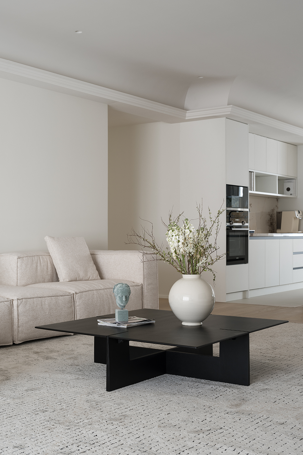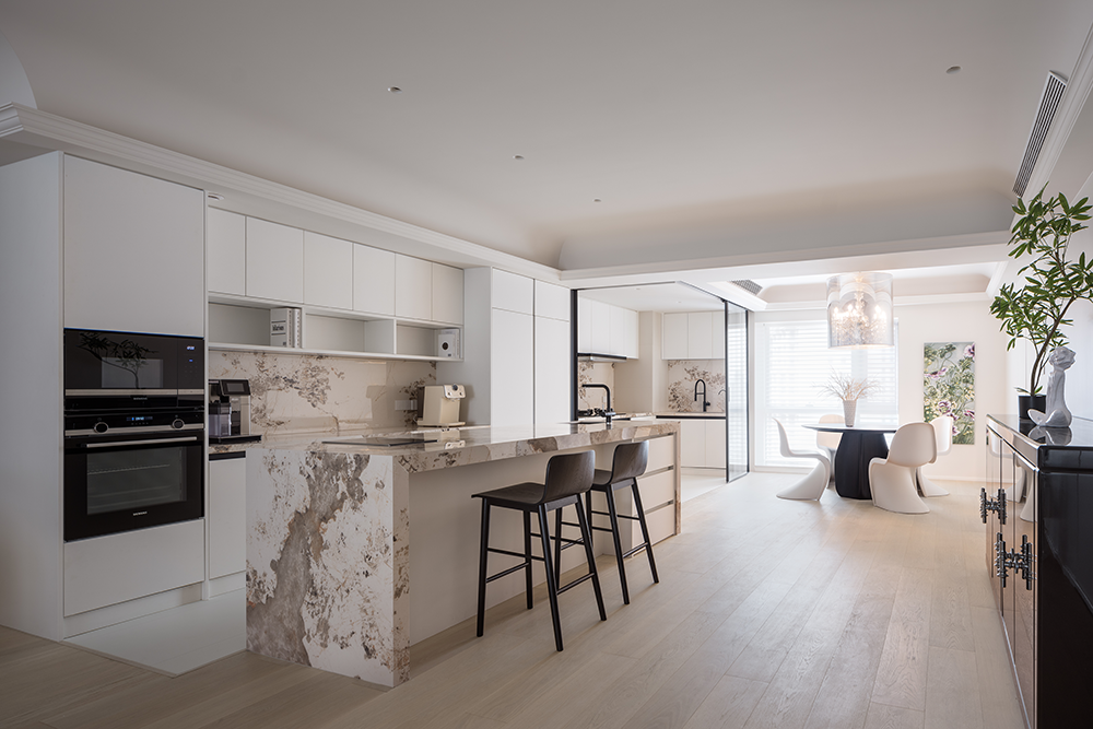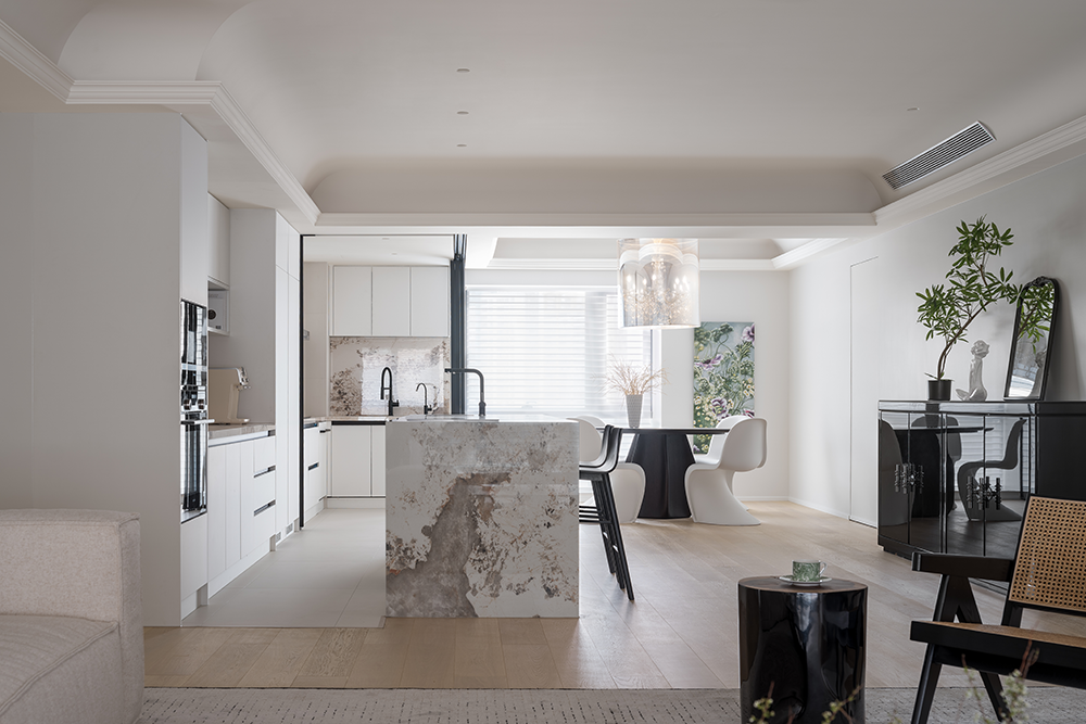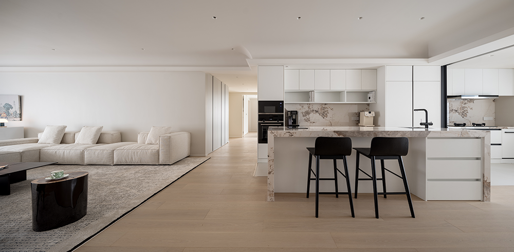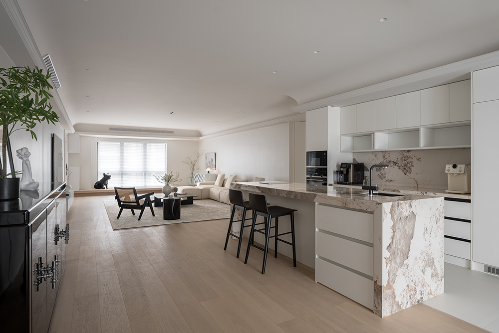 客厅串联起节奏分明的生活动线,作为时尚自媒体博主,女屋主对光线以及空间的氛围要求较高,设计师将采光较好的厨房打通,客厅墙推掉后,横向布置为中西双厨。