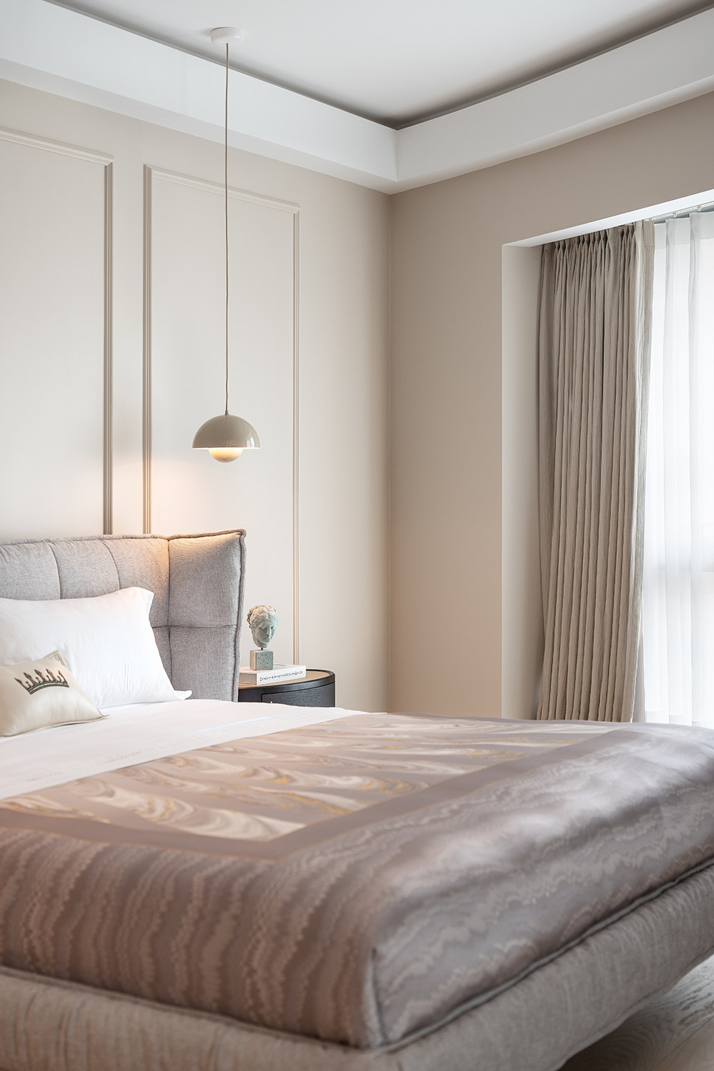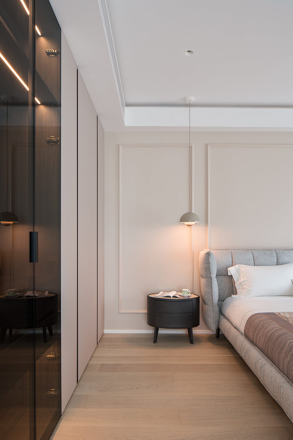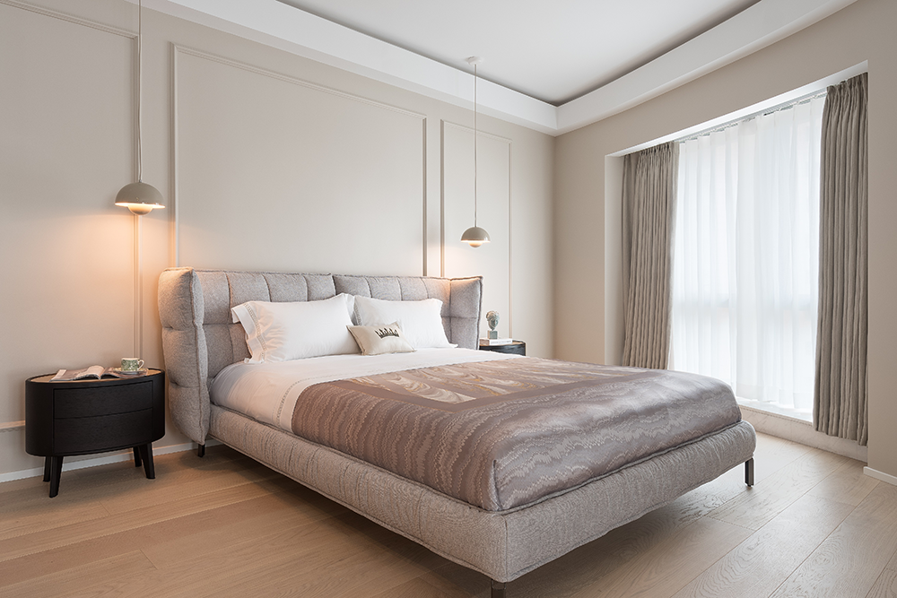 主卧整洁宁静的配色,呈现至简至美的气质,细腻简约的饰面,床头背景墙的法式线条元素,原木质感的材质,柔和的灯光设计让空间富有节奏感。