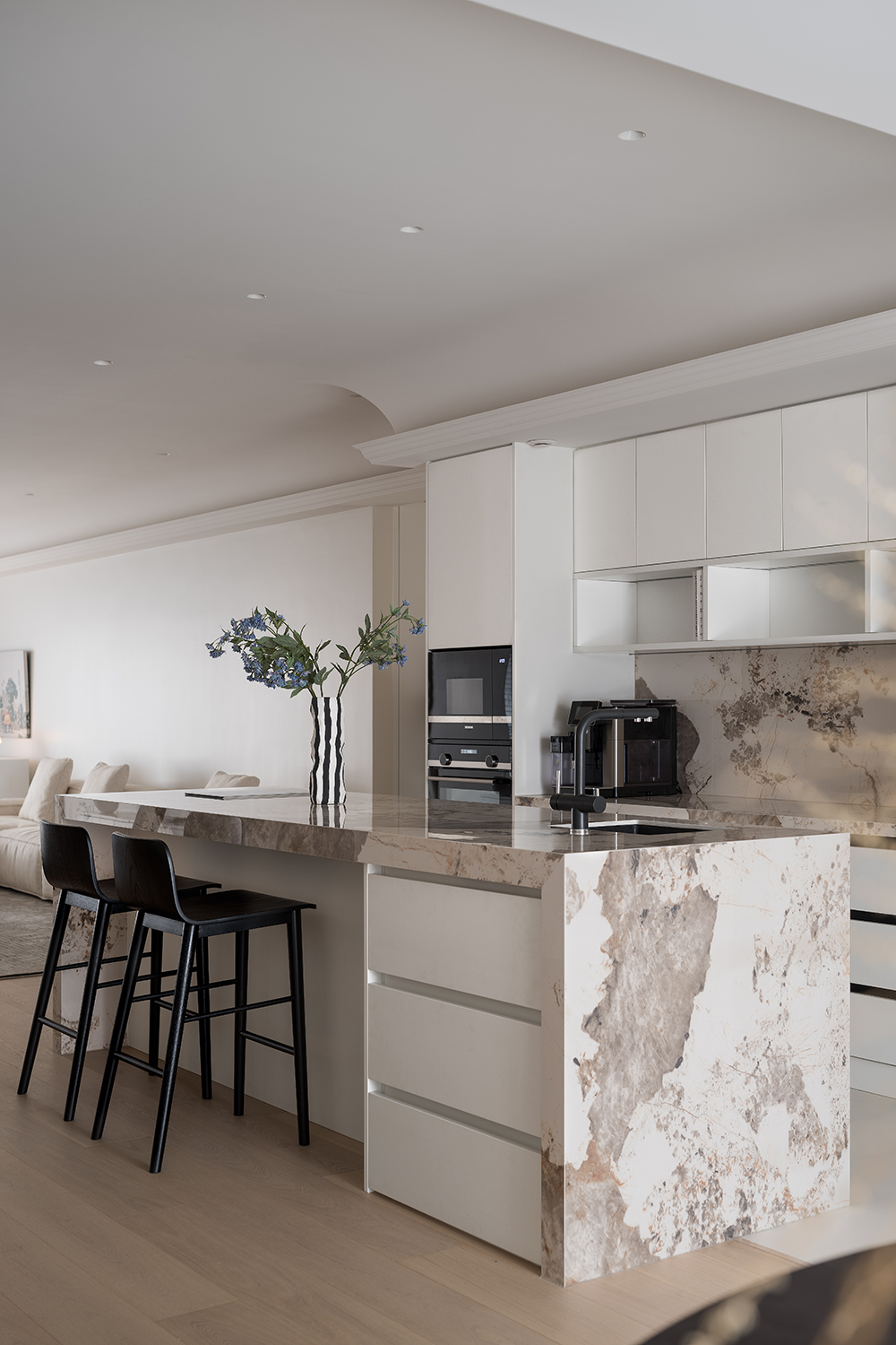 餐厨区域,重新绕梁做了石膏线吊顶处理,顶部设计成轻法式穹顶造型,轻盈石膏线采用内收贴墙处理,简约大气,视觉上极简留白又不失设计感。