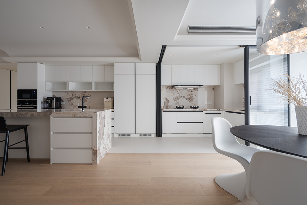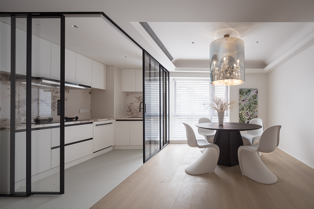 中西双厨,可以根据日常用餐需求将推拉门进行功能调整,餐厅与圆桌相得益彰。