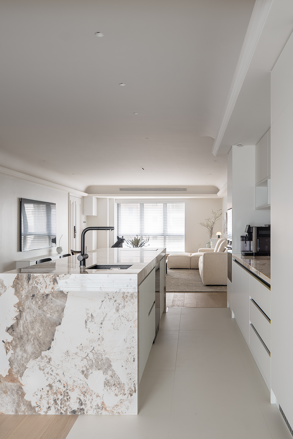 新增设的3m左右岛台作为中转区,既具有收纳功能,也加强了互动感,屋主可以边制作美食,边观察小朋友动向,也可以在此微办公。