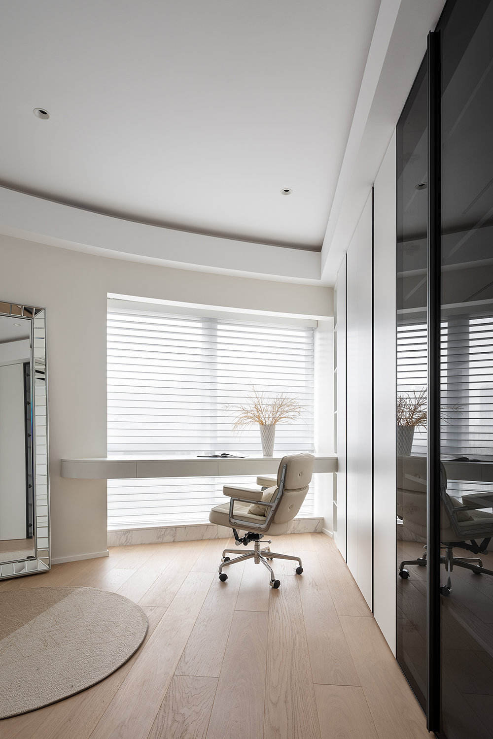 考虑到屋主行业的特殊性,设计师设计了内外两个衣帽间,外侧为女屋主的时尚小天地,里侧为男屋主的衣橱。后侧的小书桌,可以阅读或微型办公。