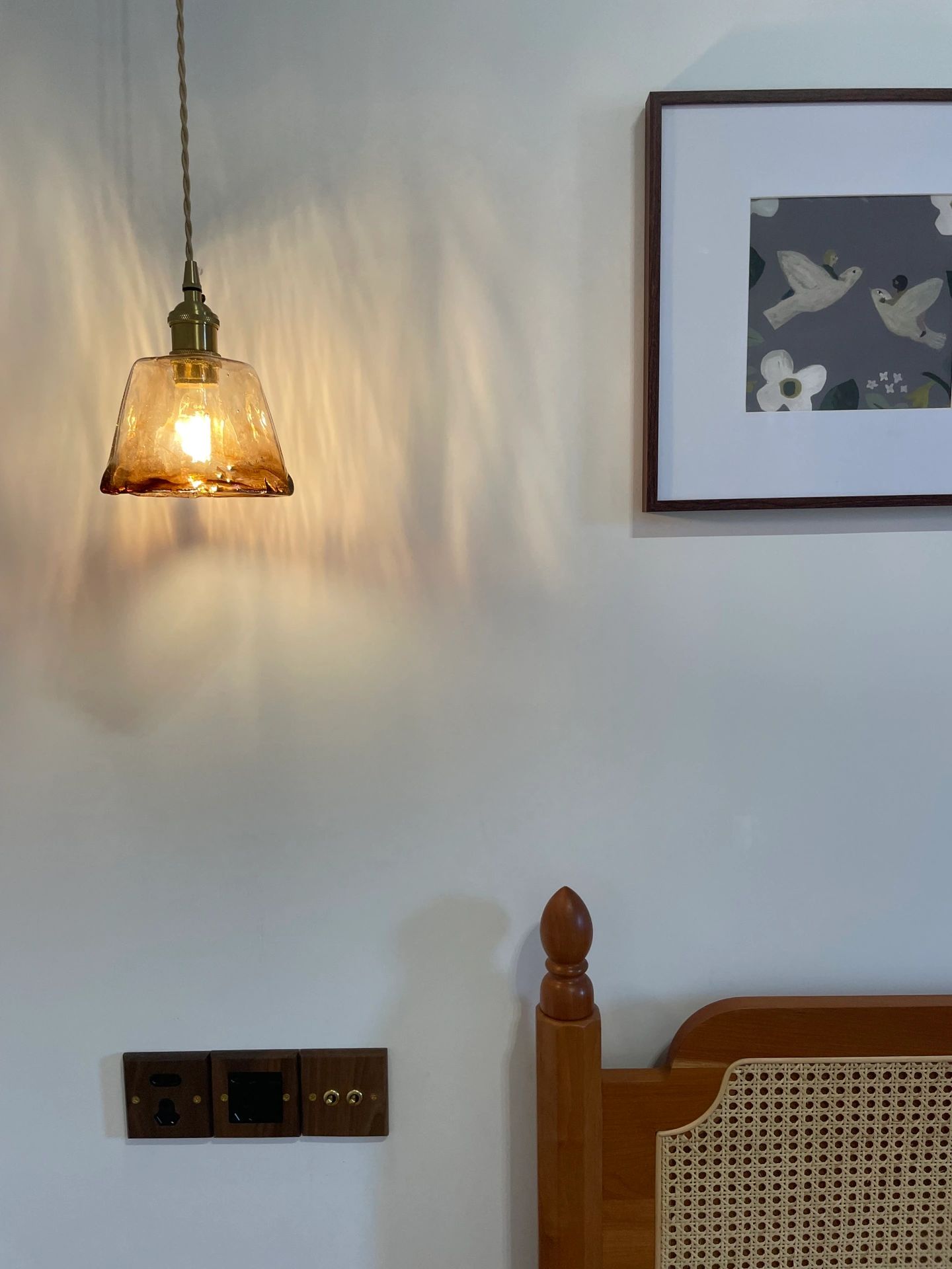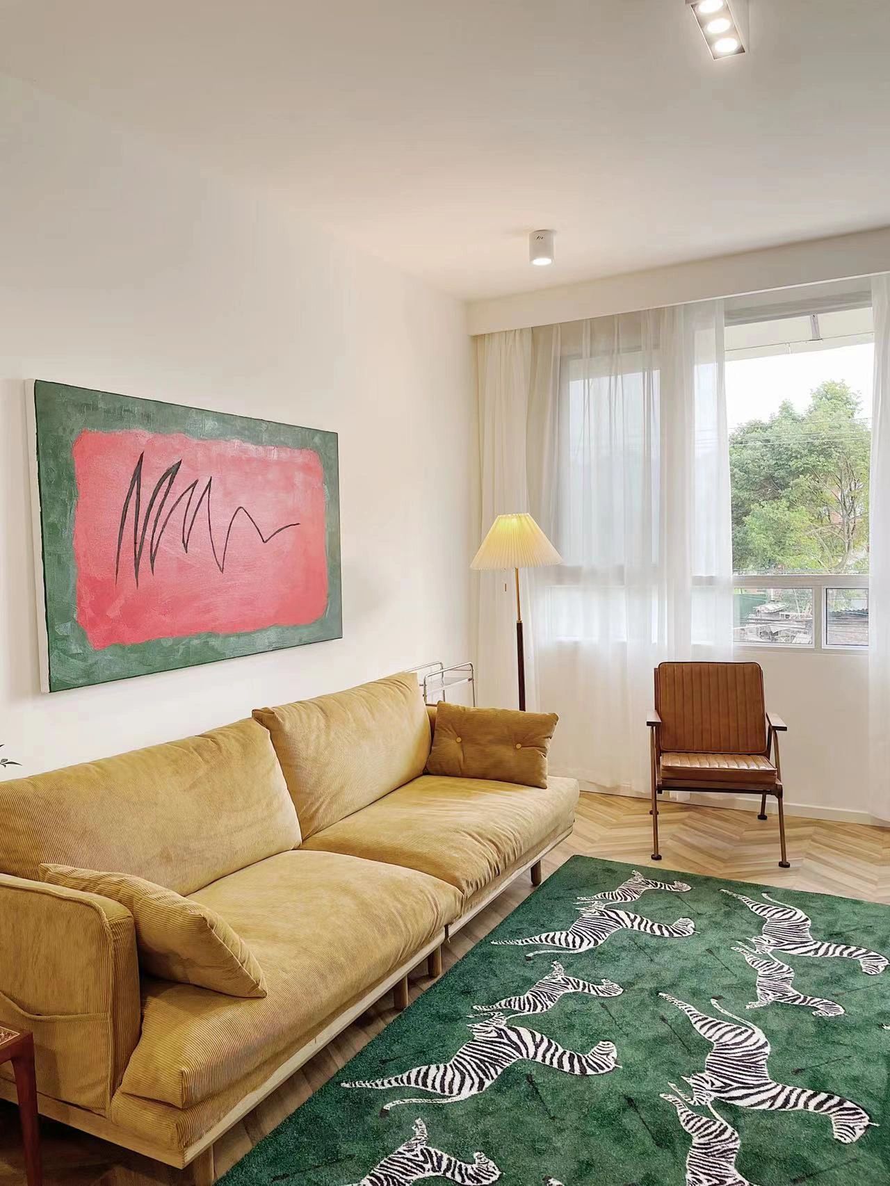 玄关与客厅用玻璃砖隔断,增加隐私但不阻隔光线,鱼骨拼的木地板,搭配上藤编风的家具,满满复古风情。