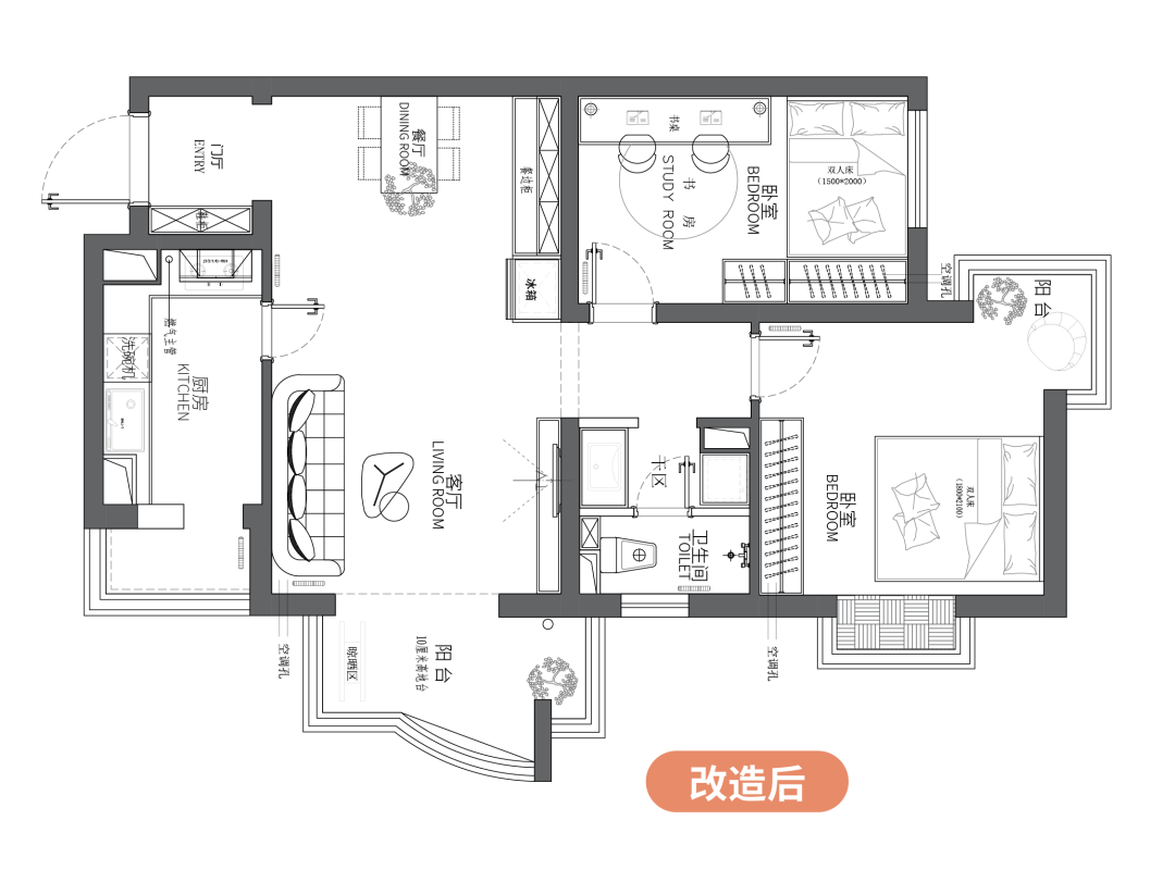 原始阳台是异形窗,配套的窗台石不够整齐,设计师索性砌地台和窗台石齐平,提高空间整体性的同时多了一块休闲阅读区