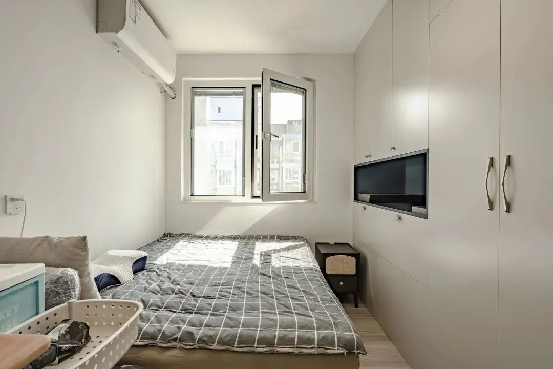 卧室双窗配置,阳光充沛。整排大衣柜,收纳力max,衣柜吊顶往前多做了5公分,提前预留了投影仪的位置,躺在床上也可以畅快观影。