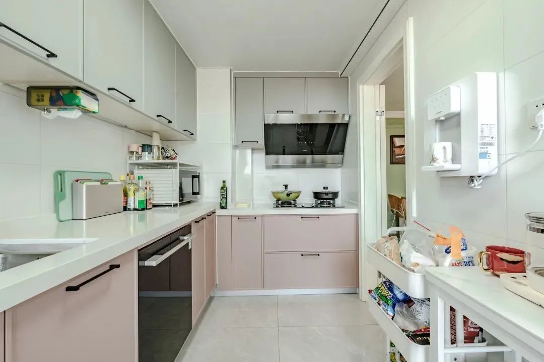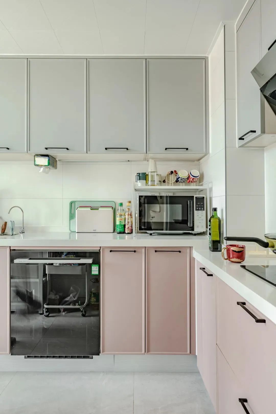 拆除门联窗后,采光更通透,橱柜选择巴黎灰撞上雾感粉,干净清新。厨房呈“L型”布局,洗-切-炒动线流畅,根据主人身高定制了高低台面,操作更加方便省腰。