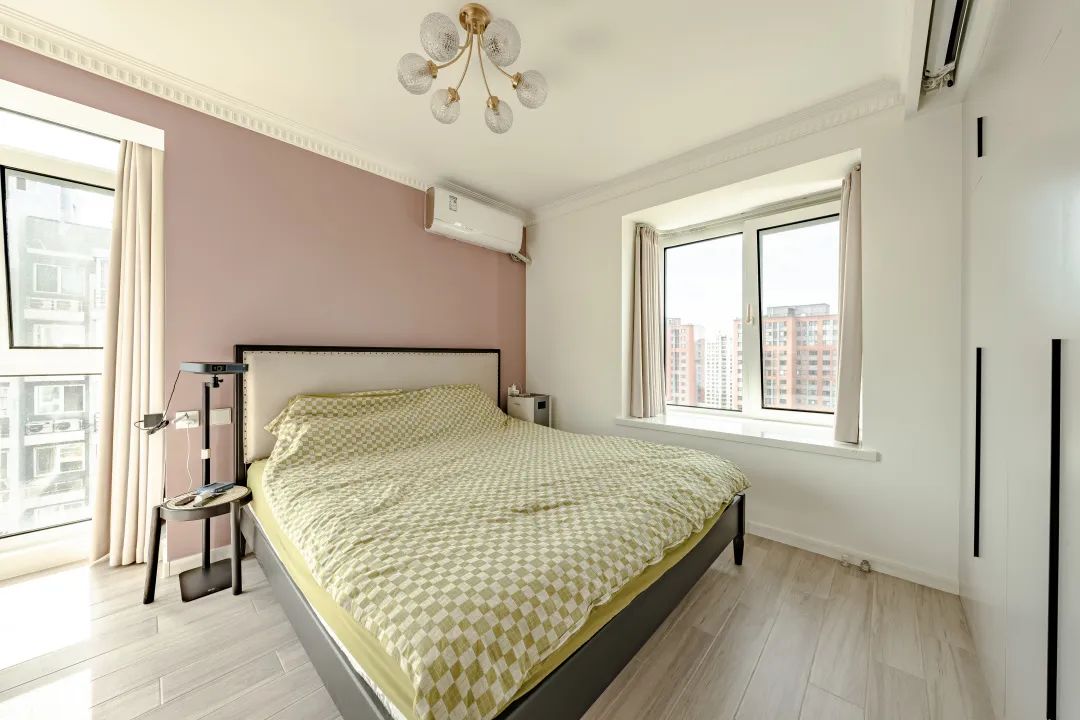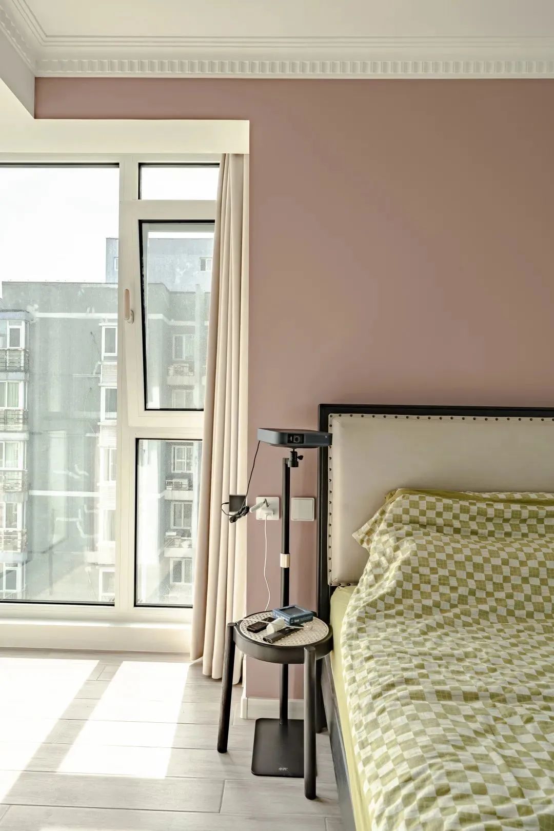 卧室选择雾感粉色调,只刷床头一面墙,不会显得太腻,一圈法式石膏线像点缀在少女裙摆的蕾丝花边,浪漫隽永。