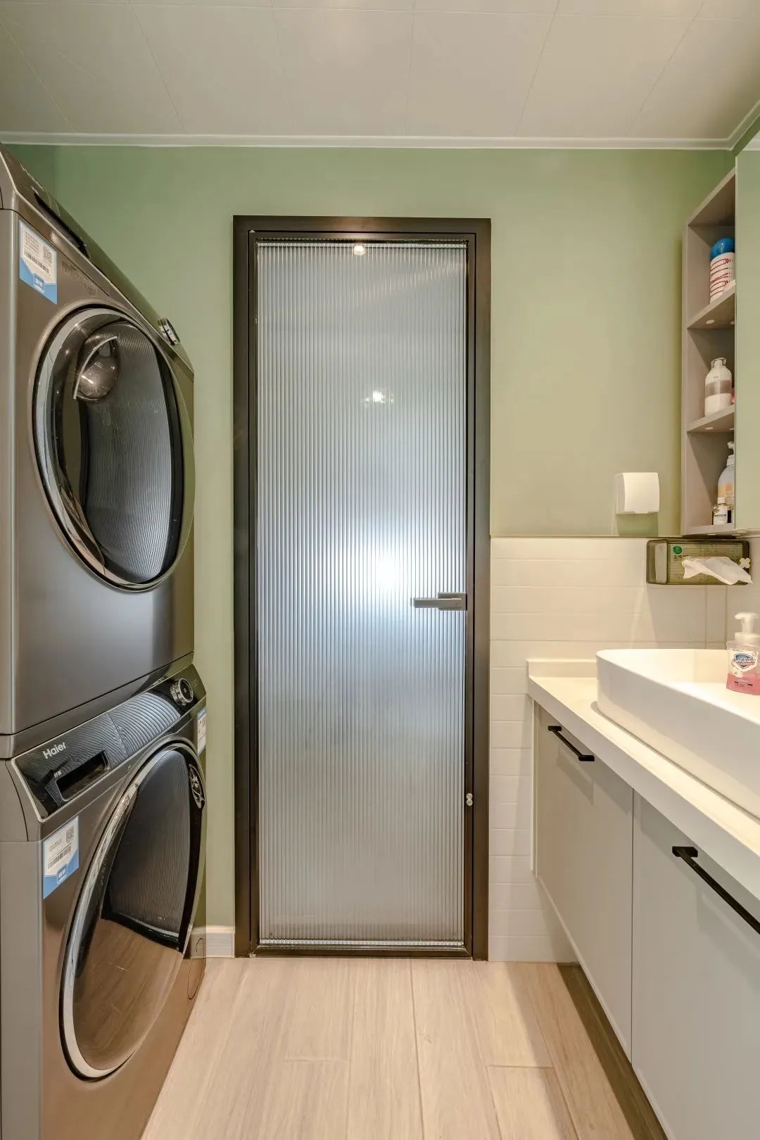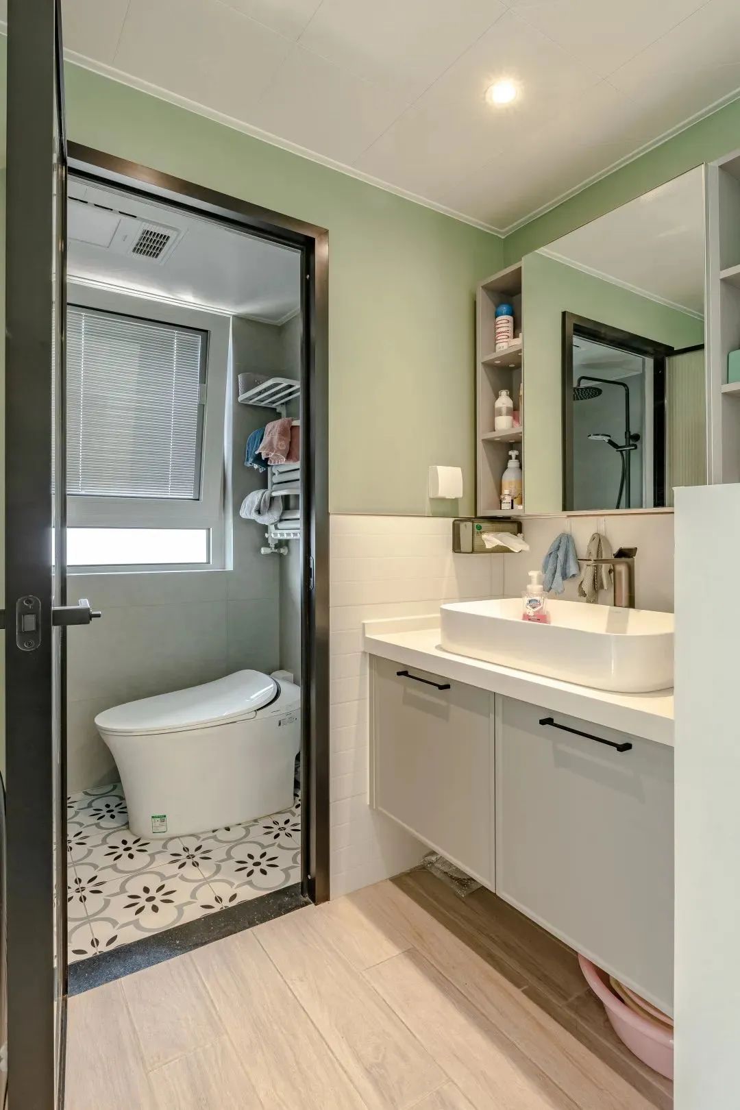 洗手间干湿分离是一定要的,拆除原始卫生间墙体,新建半墙,用水波纹玻璃砖遮挡洗手台的杂乱,让空间更通透,使用效率更高