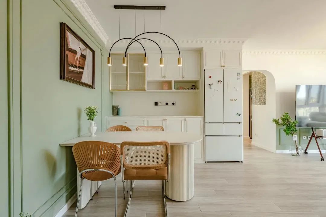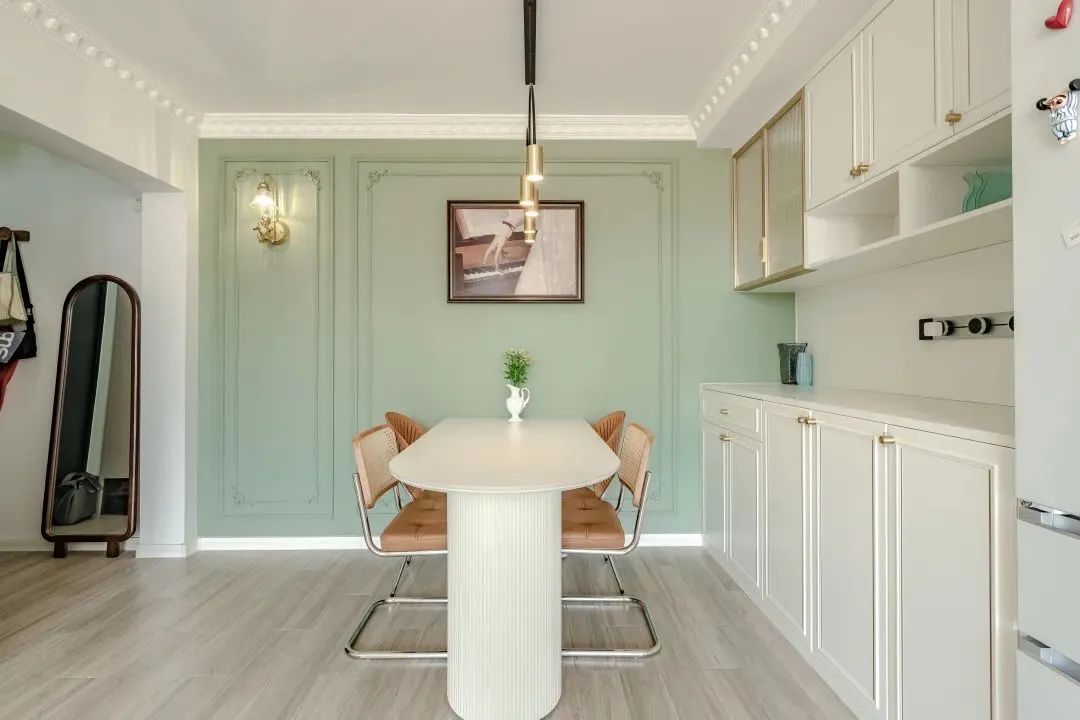 壁灯+挂画+复古石膏线+薄荷绿墙漆,打造法式氛围背景墙。白色罗马柱圆角餐桌+棕色贝壳椅+弧形金属吊灯,演绎法式的浪漫精致。