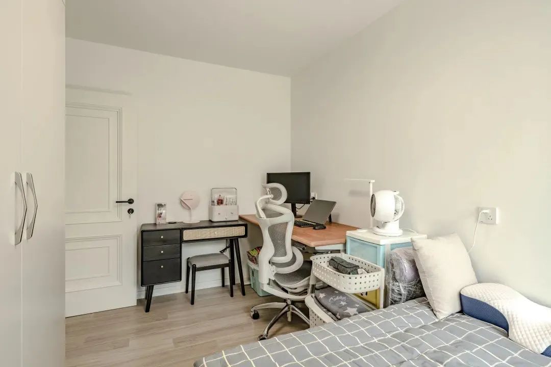 次卧兼具书房和客卧的作用。整排的衣柜+学习办公书桌+女主人的化妆桌,不做太多固定家具,将来有了孩子也可以灵活多变~