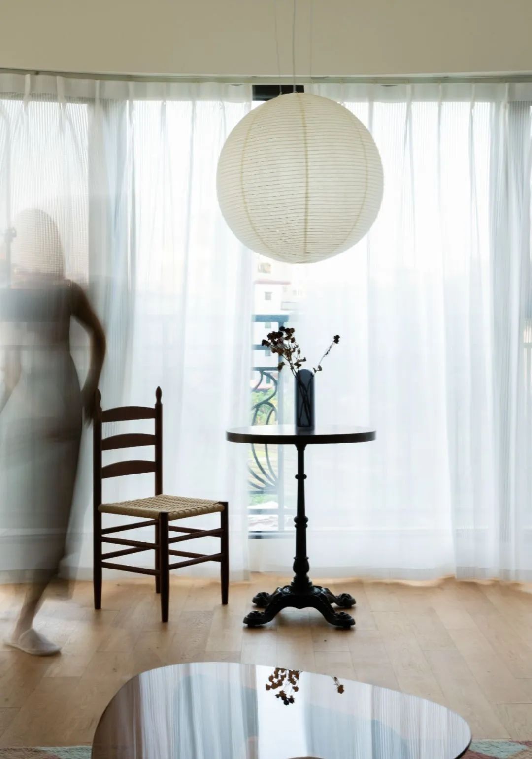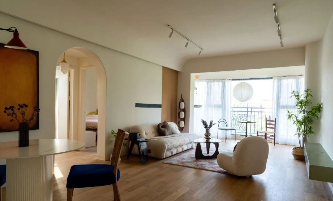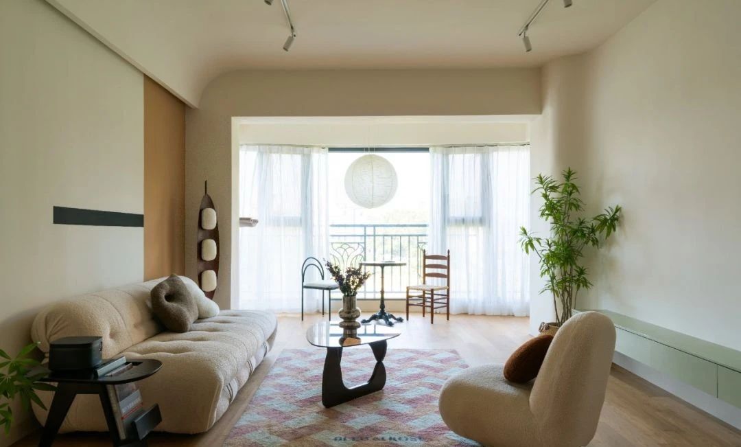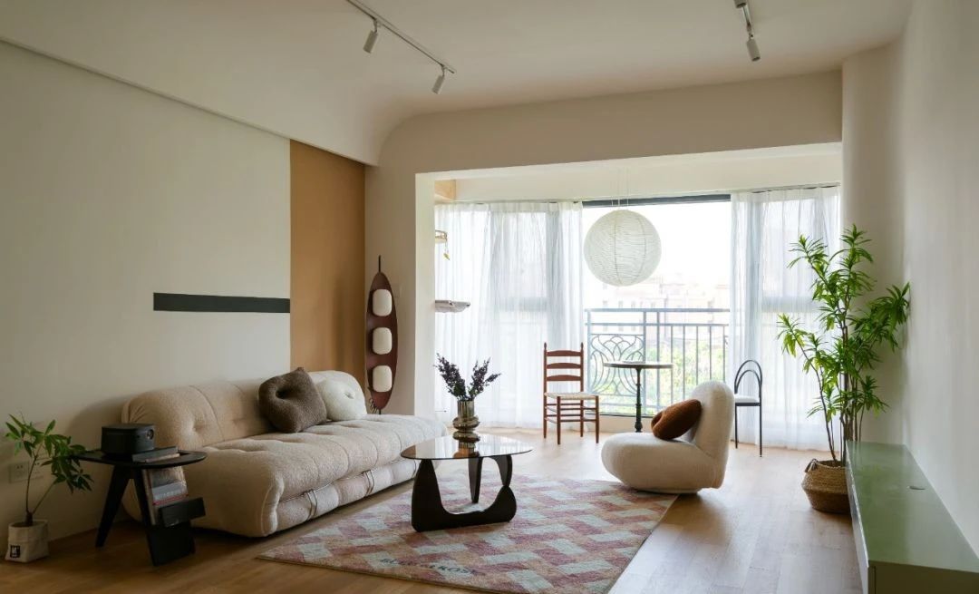 沙发区利用弧形作出灯带,电视墙与阳台柱子的交接也是利用弧形去过渡; 远处阳台悬挂的自然主义圆球纸吊灯,充满禅意,会令人感到宁静安心。