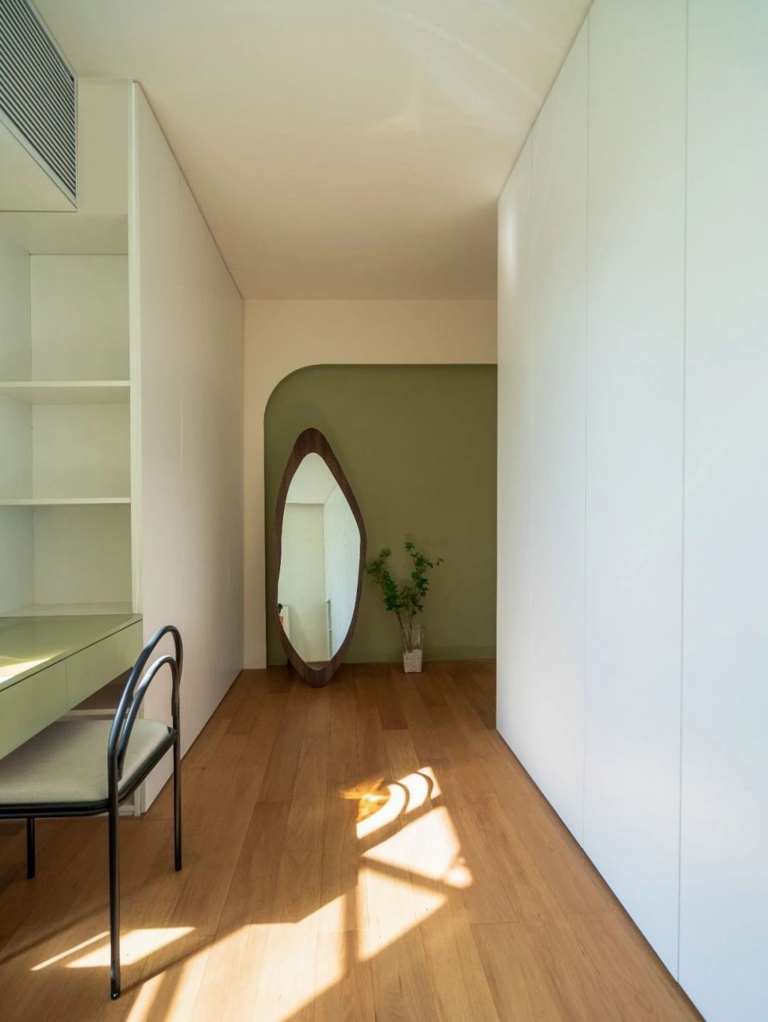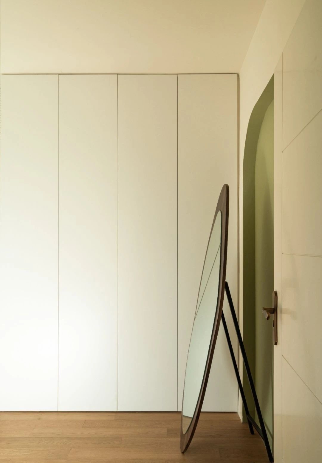 衣帽间一门到顶的柜门比较简约,加上曲线造型的全身镜和弧形造型墙,曲直有度,更为生动一些。