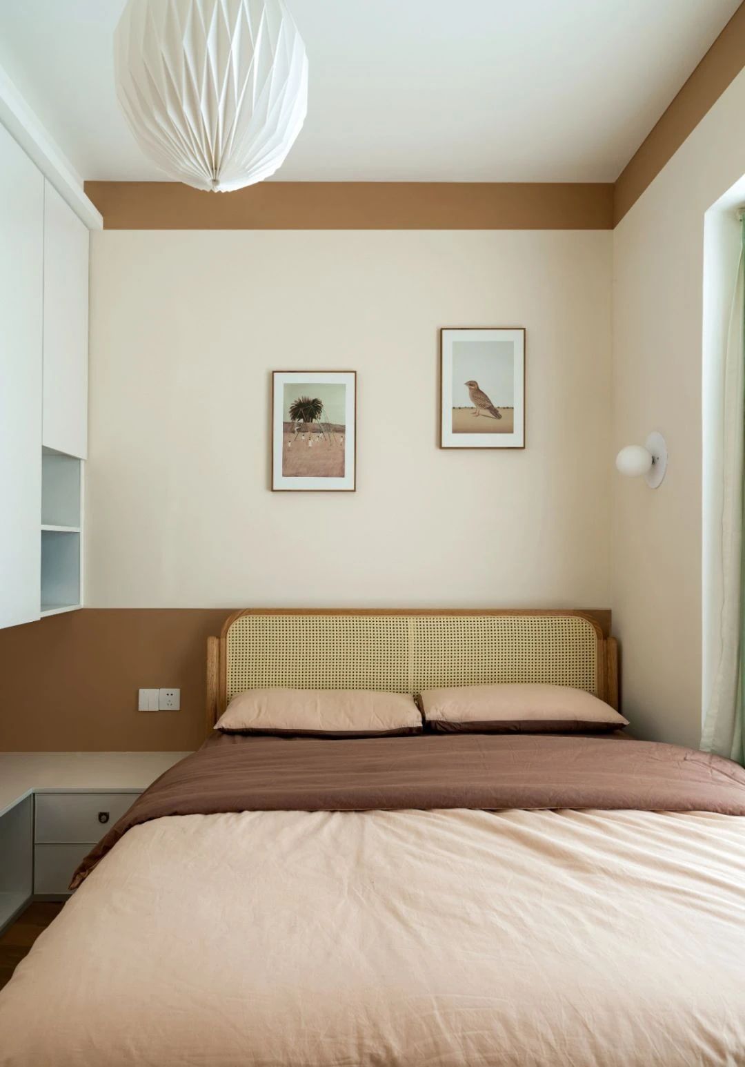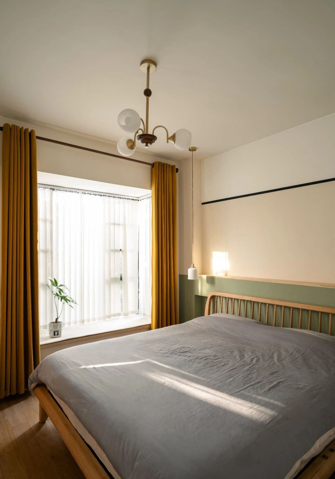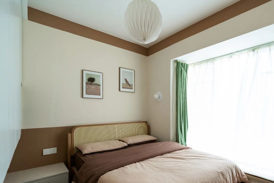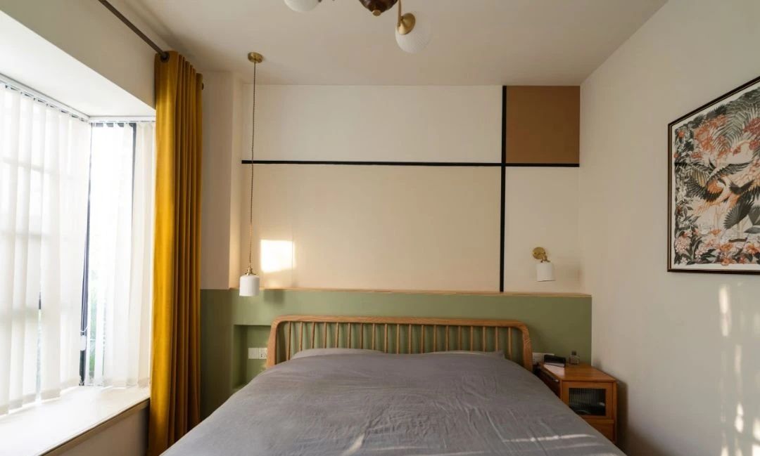 复古的灯具和格栅的床背有点混搭,但主旋律没有改变,一直都是轻复古的日式氛围;窗帘搭配黄色的遮光帘,与室内灯具上的金属材质的色系相互融合。