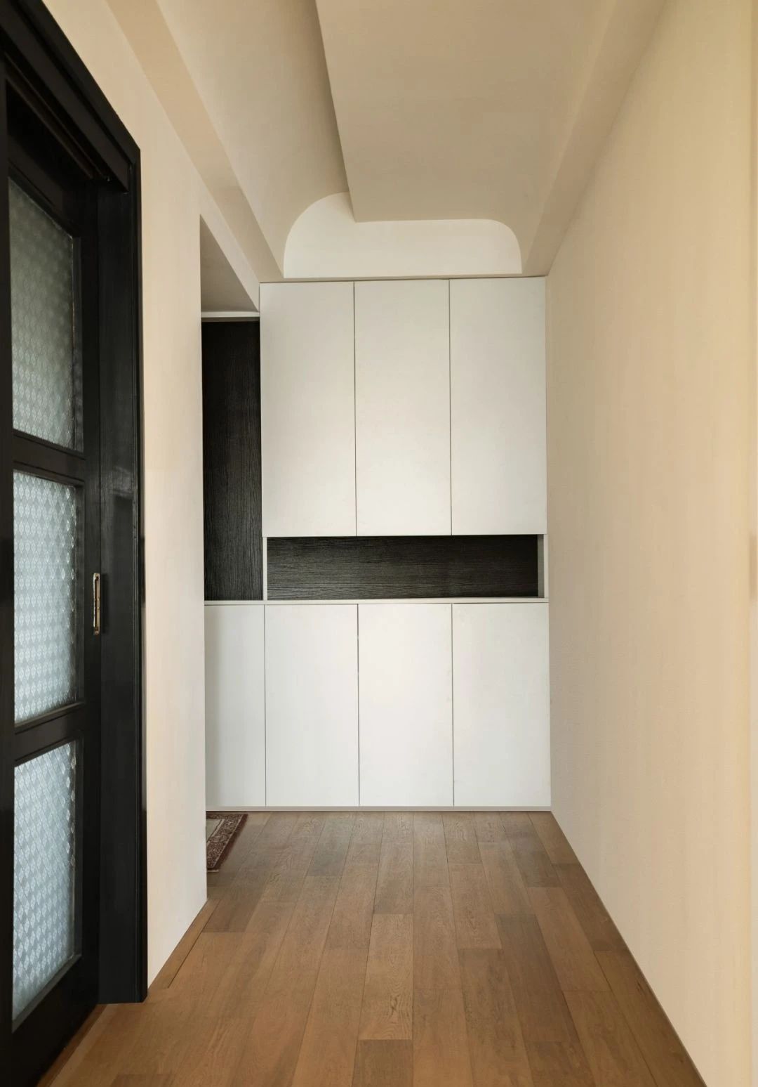 玄关的吊顶根据原始吊顶进行了造型调整,并增设了玄关柜,保证日常收纳和展示。