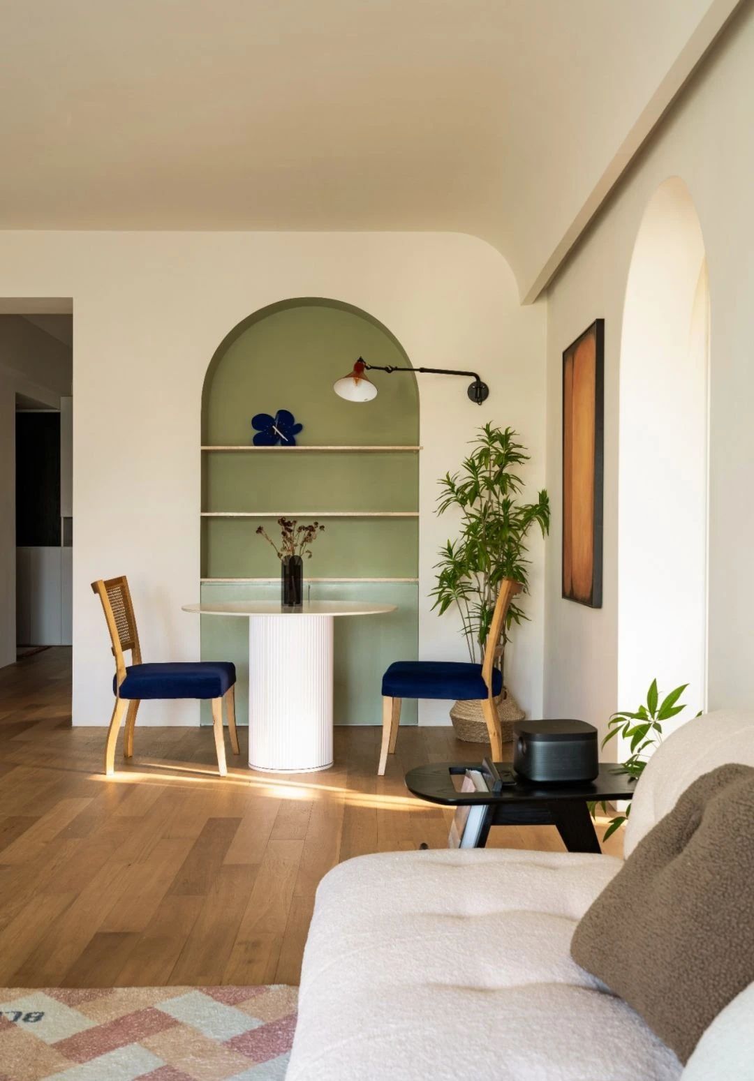 从客厅的角度看向餐厅,两个同比例的圆拱,相应成趣。
