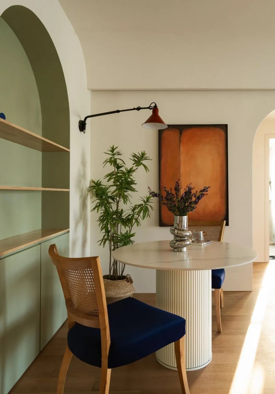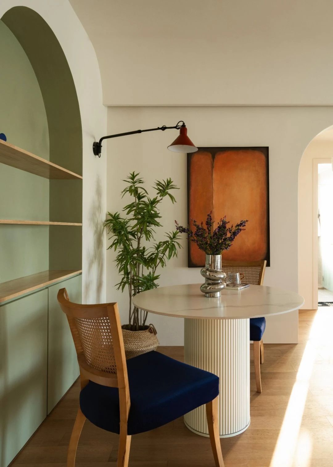 以壁灯替代吊灯,与餐椅的复古感形成呼应。轻轻弧动的椅背与餐桌的直线条形成对比。