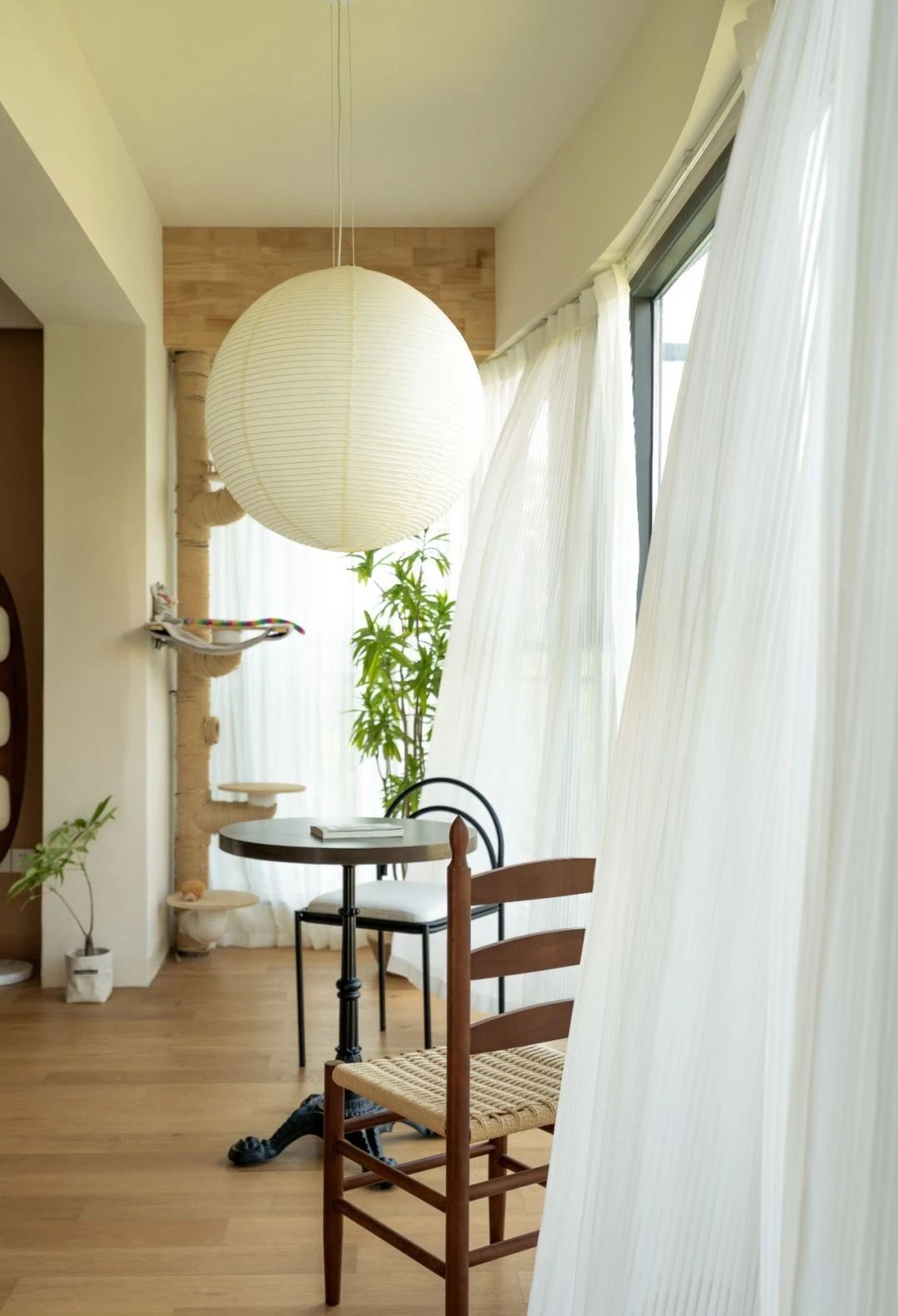 整个房间色彩偏重于原木色和藤编等天然材料的颜色,以及米色的墙面都是自然朴素的,诧疾风的菠萝折纸的吊顶也是一种平静禅意的情景表达,烘托出中古感。