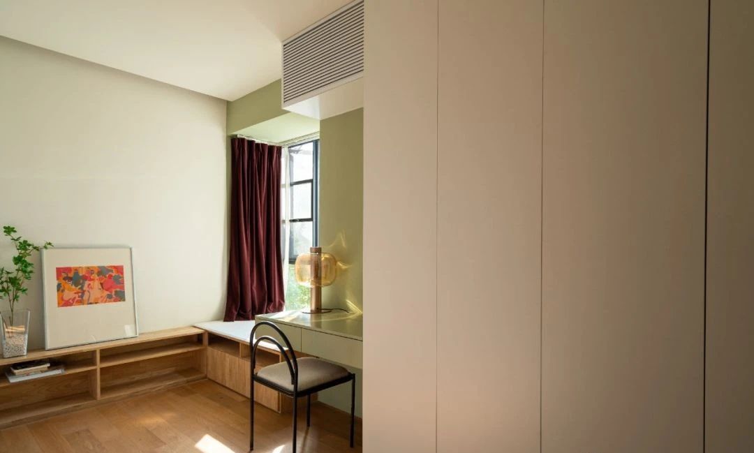 衣帽间的色系是绿色和暖灰色的搭配,平时可以在这里梳妆、看书、撸猫。