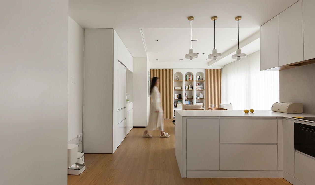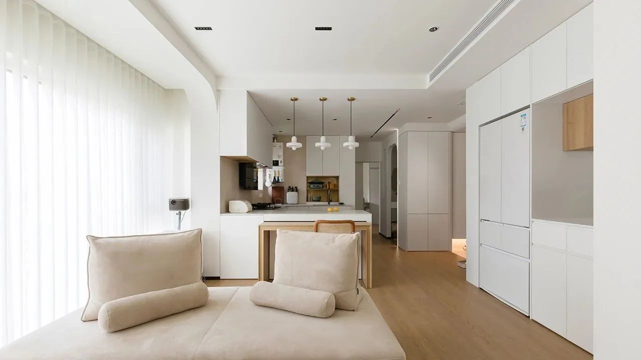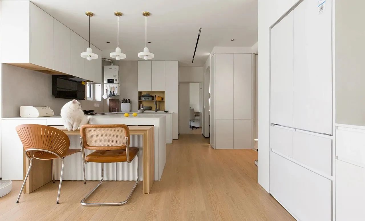 2. 屋主综合各种情况后最终选择了开放式厨房,去掉厨房隔墙后,客餐厨融为一体,采光面积加大,视野开阔,岛台+推拉餐桌完美利用空间。