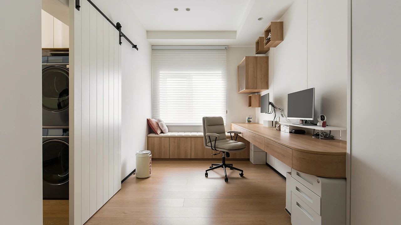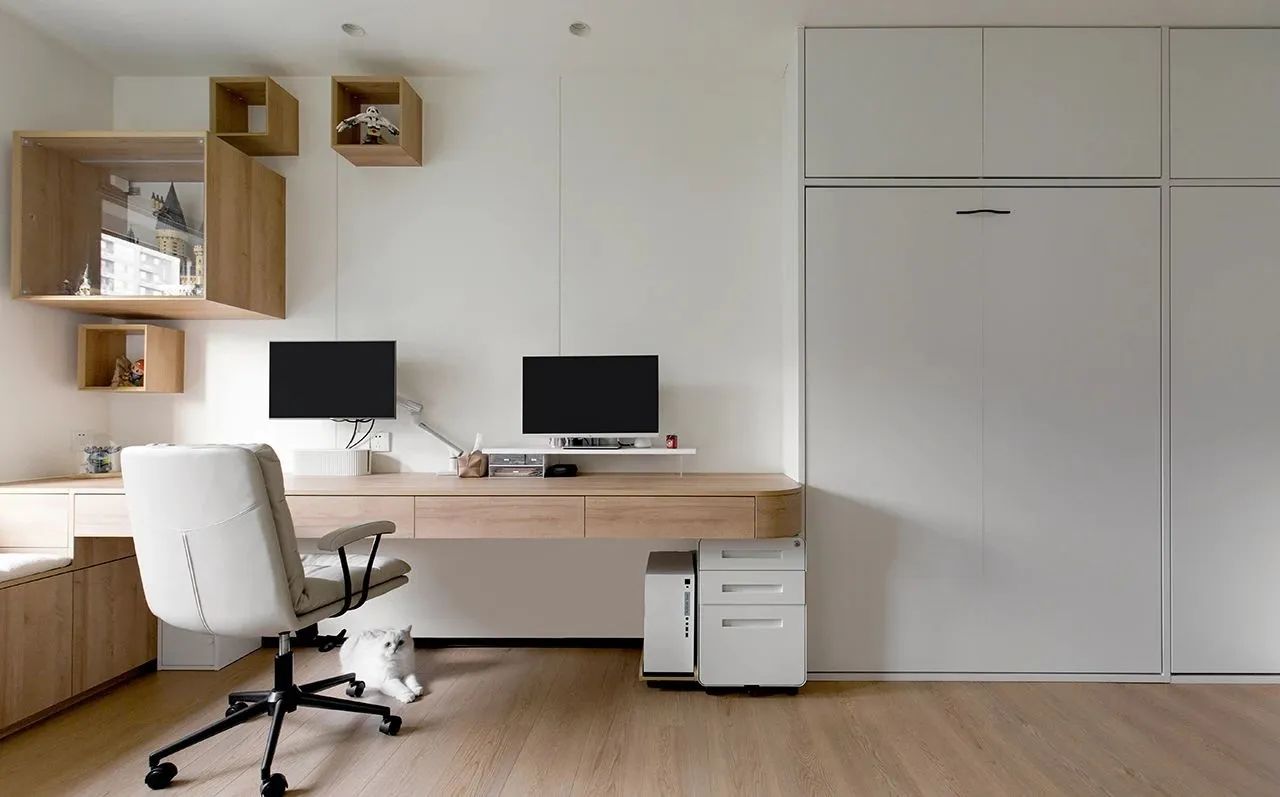 同样是将次卧分两部分使用,靠窗部分为工作区。超长工作台,台面长度2.4米,由悬浮支架支撑。配有4个60公分宽的抽屉,收纳所有办公用品。