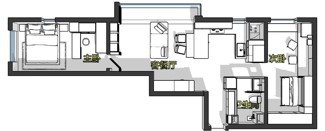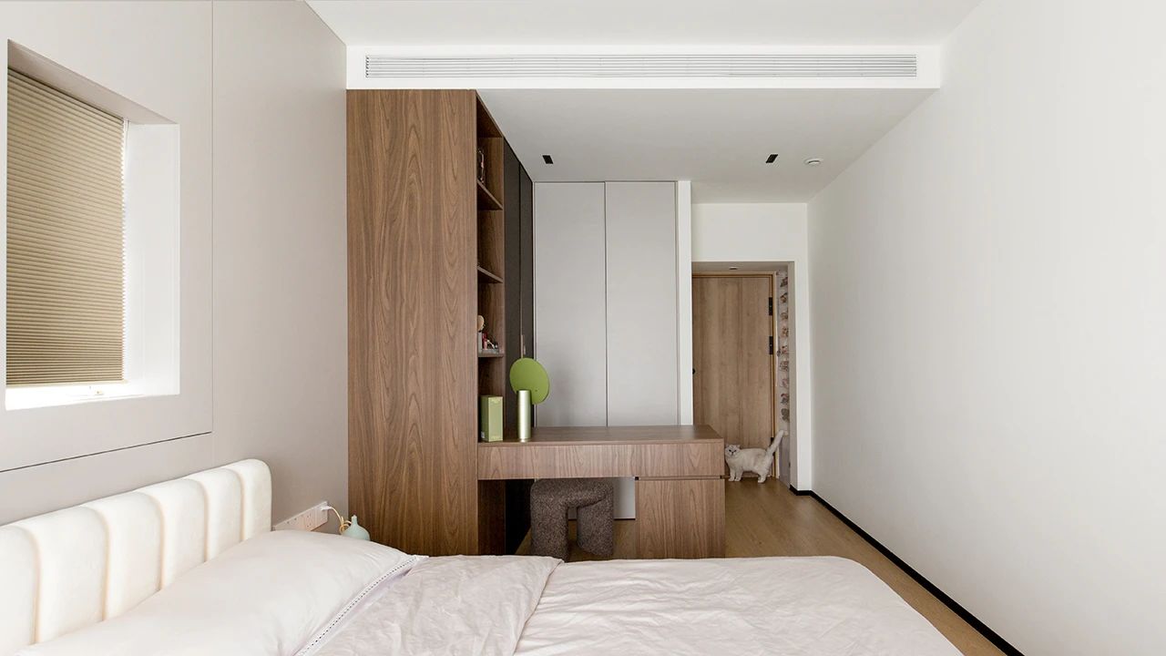 空间整体延续了客餐厅的风格,灰、白、木配色清爽简约,不大的空间更适合。