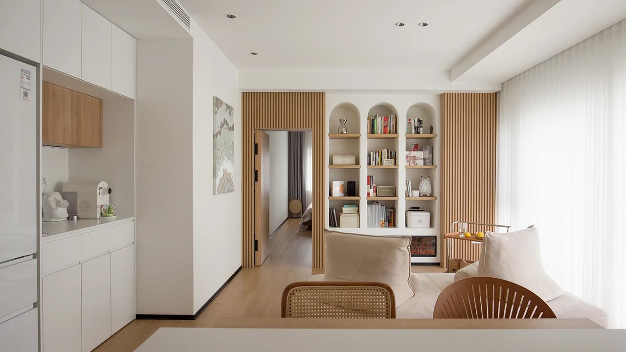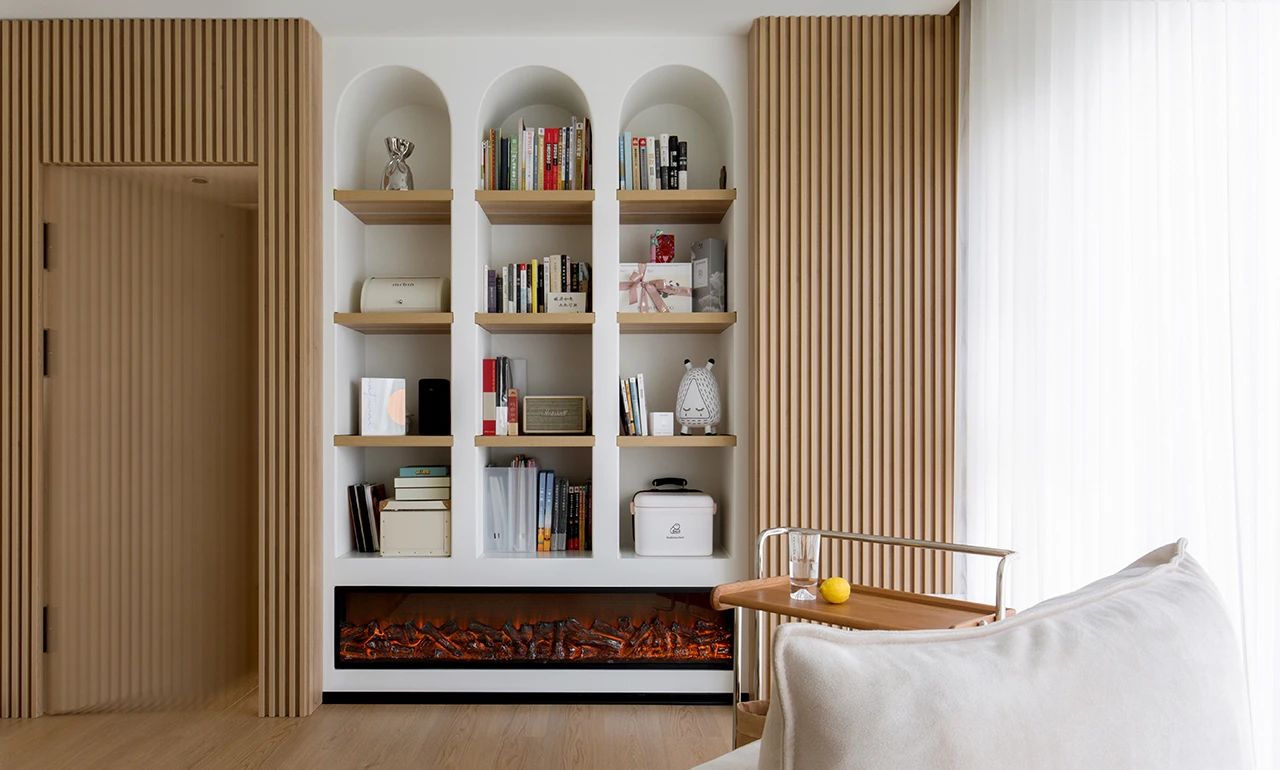 客厅的亮点便是这面背景墙,两边对称布局的埃维拉木格栅板,将视线集中到中间的书架,书架的拱形造型又与门厅和卫生间的弧形相呼应。