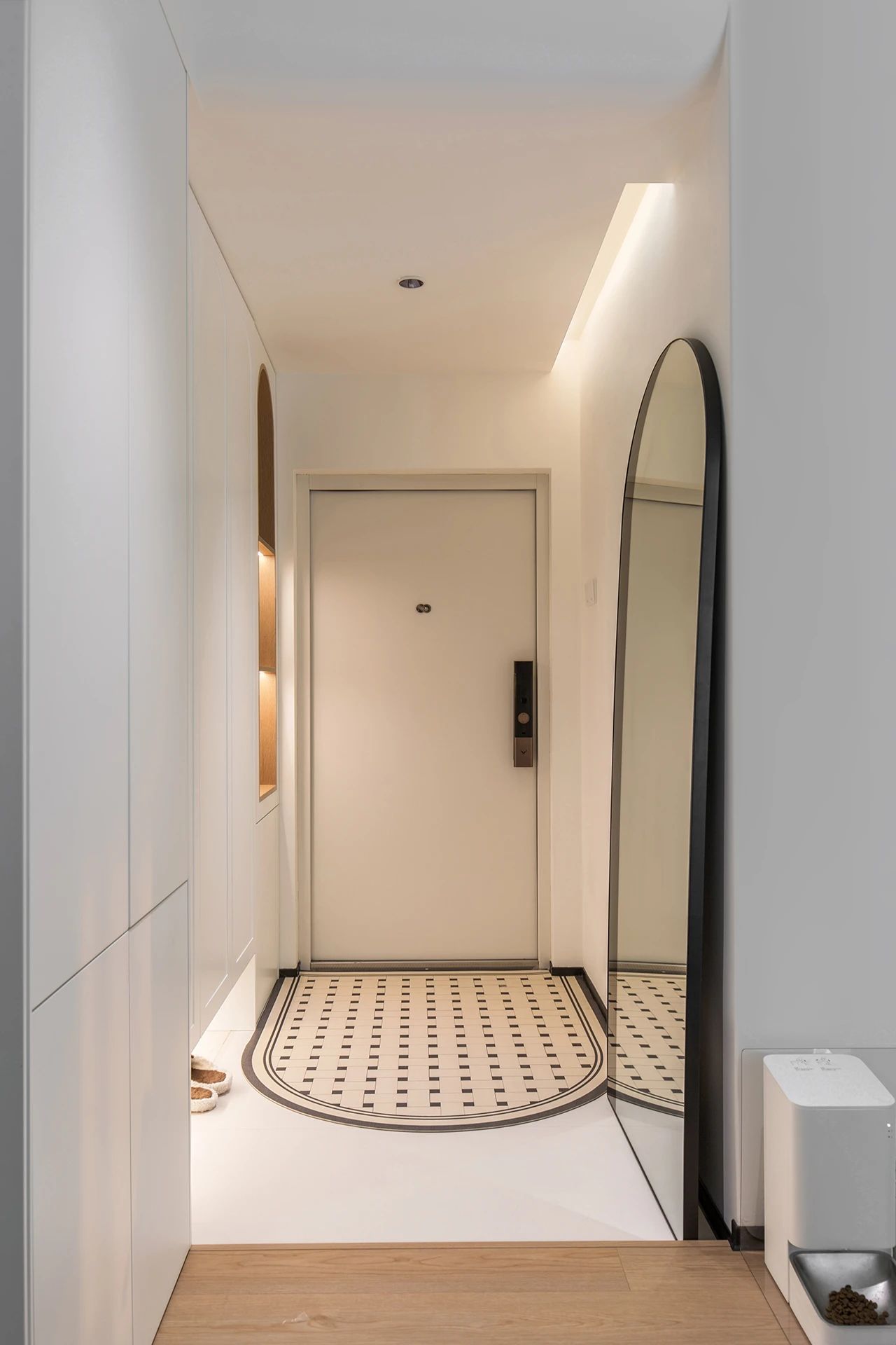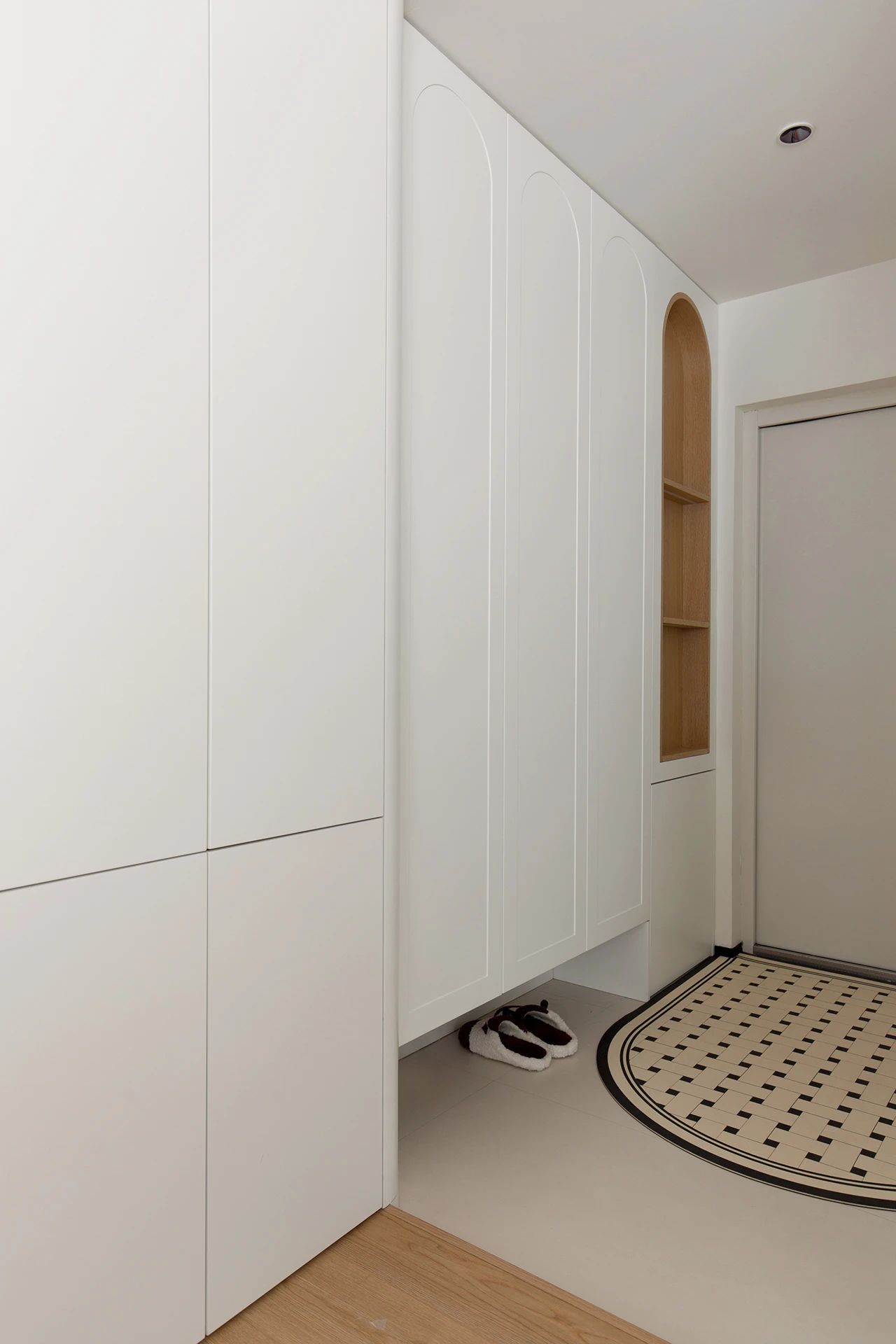 其中展示柜做了拱形造型并进行木色的跳色处理,鞋柜的柜门也同样有拱形元素进行呼应。背靠烟道的展示柜为开放式,进深10公分,用来展示和收纳随手物品;鞋柜底部留了25公分的高度,用来放拖鞋。