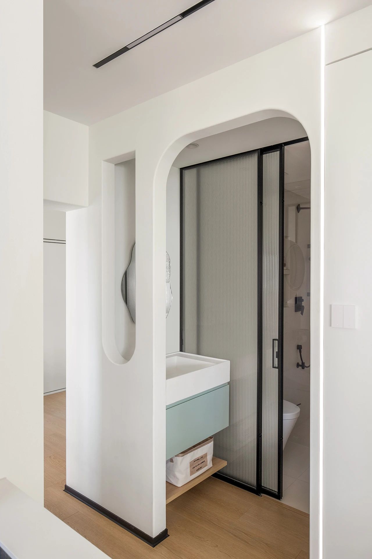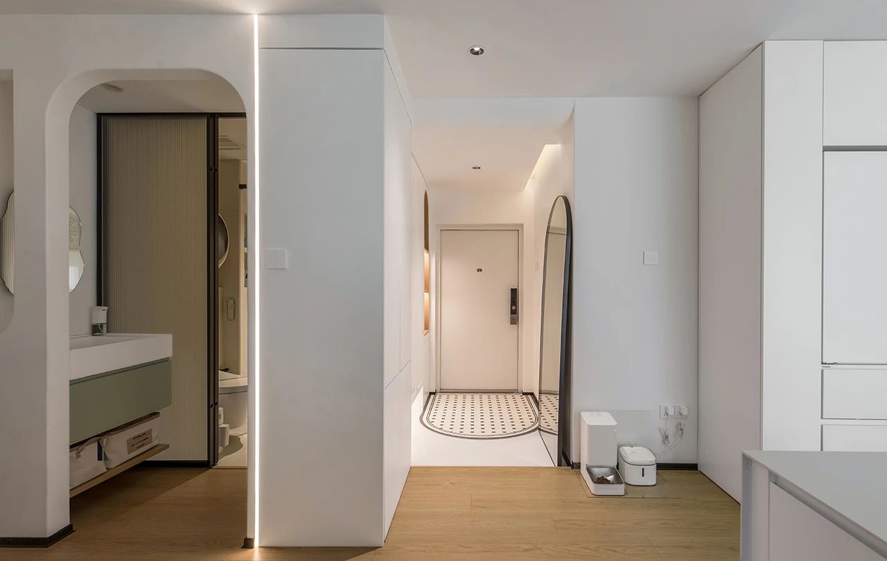 洗漱池的左侧,隔断墙体上开了倒弧形的洞口,让空间更通透。进入卫生间的门洞同样做了弧形处理,旁边嵌入竖向灯条。