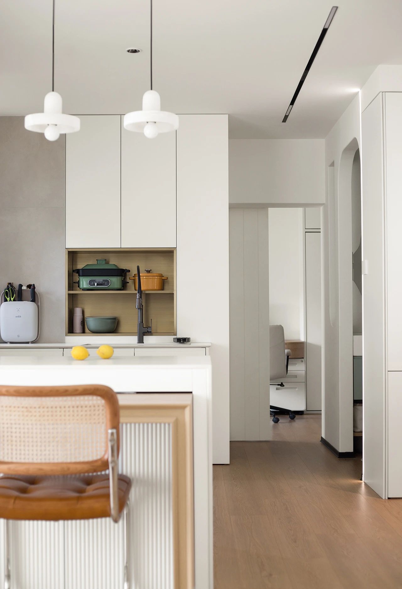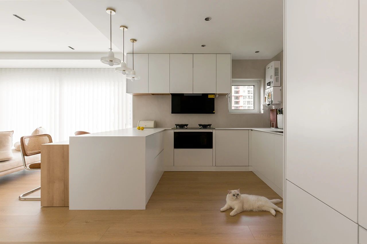 厨柜门板与全屋其他柜体门板一致,台面为1.3公分厚岩板,颜色为干净的珍珠白,和柜体的颜色一致。
