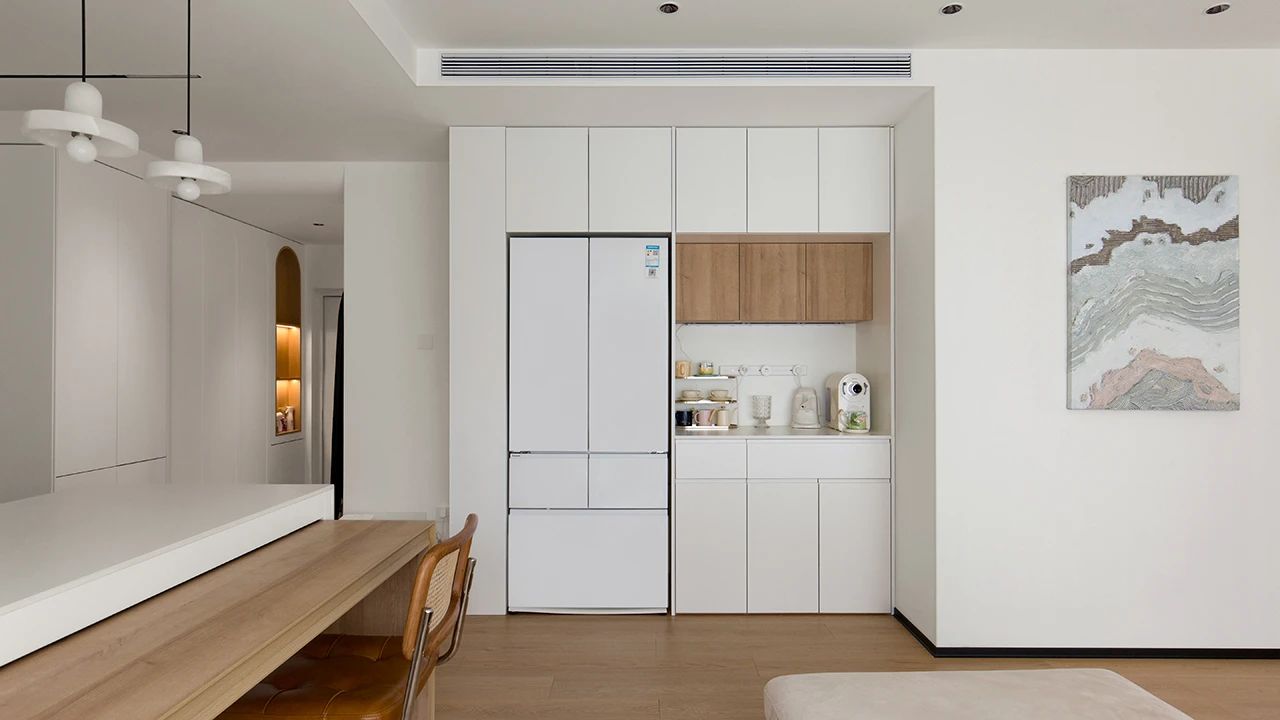 餐厅的旁边配有餐边柜和水吧台,冰箱完美内嵌入柜体之中,无把手设计保持空间视觉上的整体性。