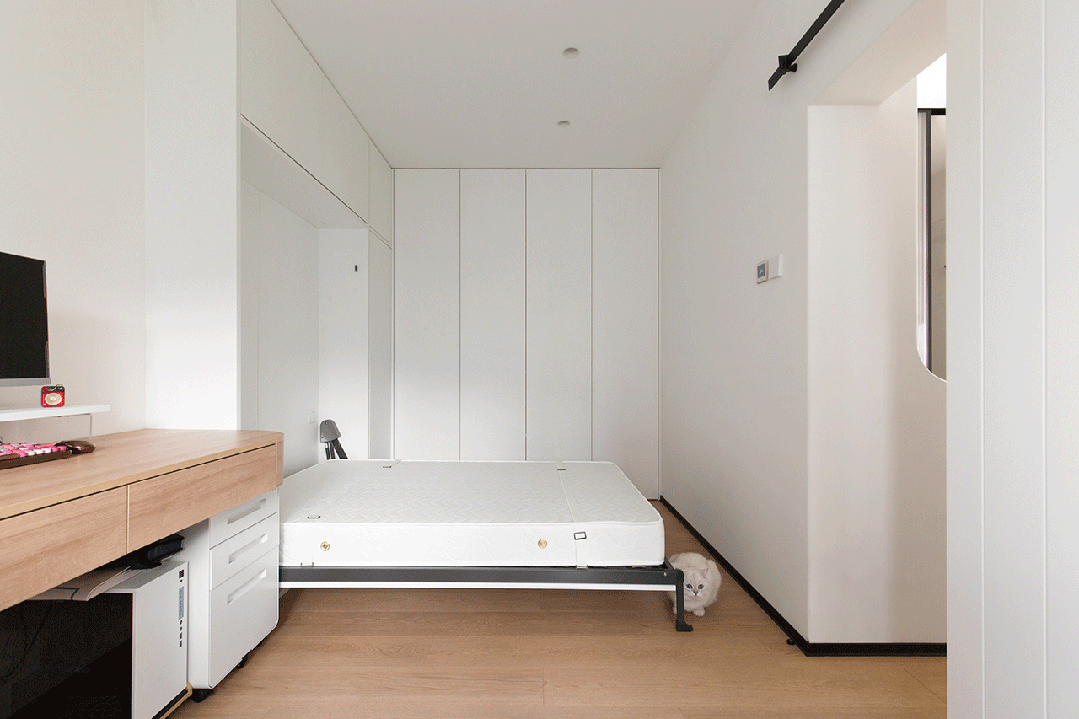 次卧用了谷仓门,美观的同时也可以解决原始门洞比较矮的问题,其次这个次卧是多功能间,平时都需要开着门,谷仓门打开不会占用里外面积。