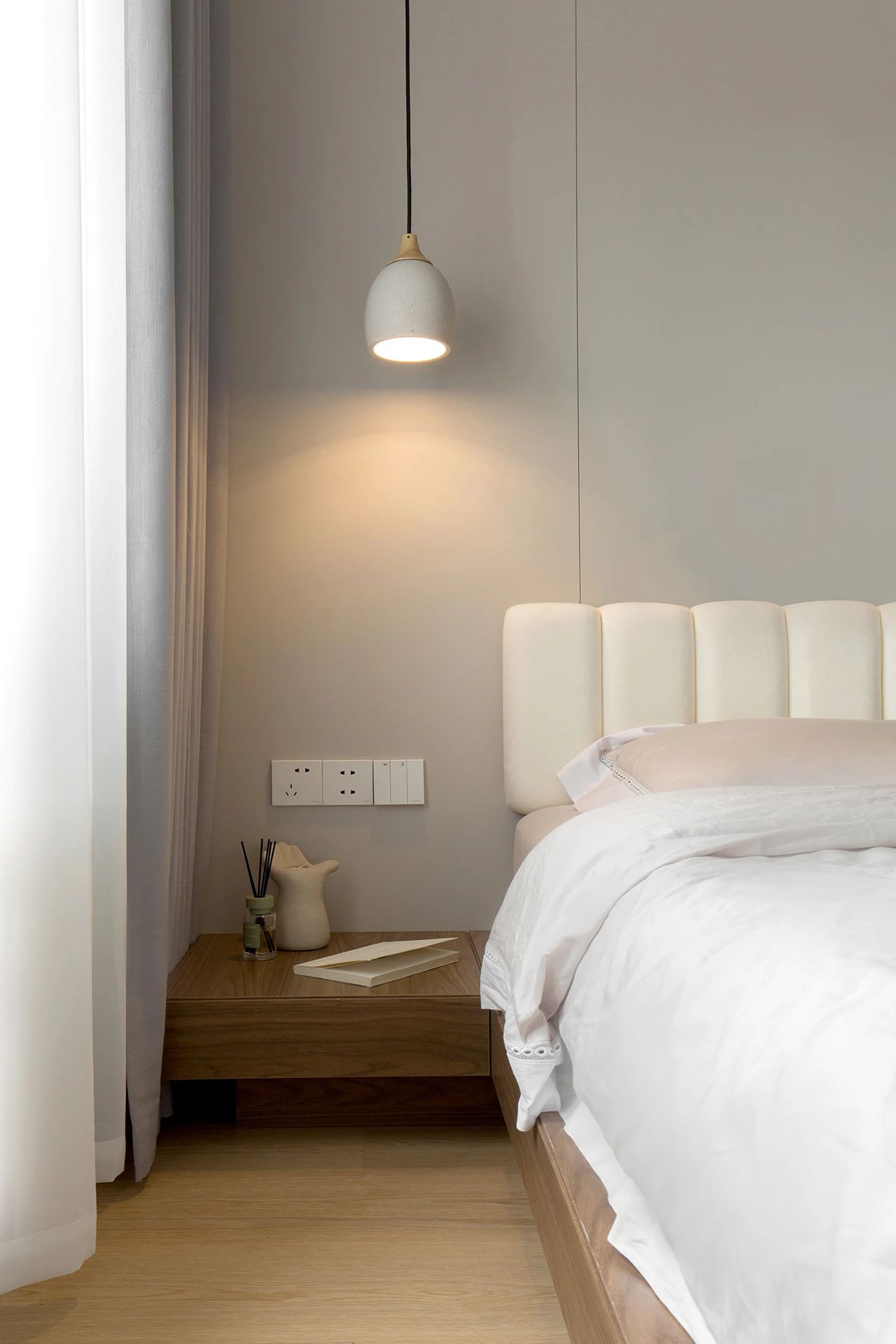 悬空床头柜避免卫生死角,与地台床持平的高度,低调内敛。