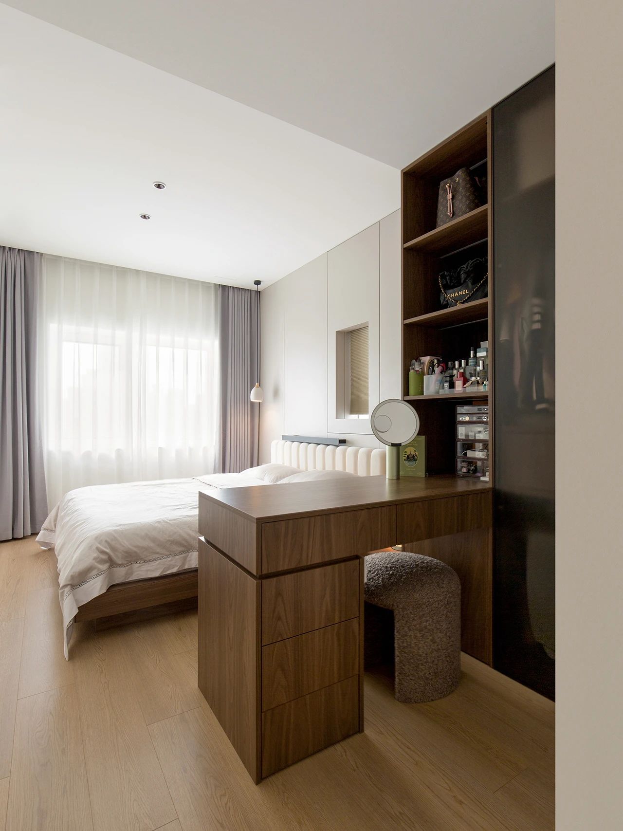 主卧划分为两个区域,进门为衣帽柜以及化妆台,再往里是床区。