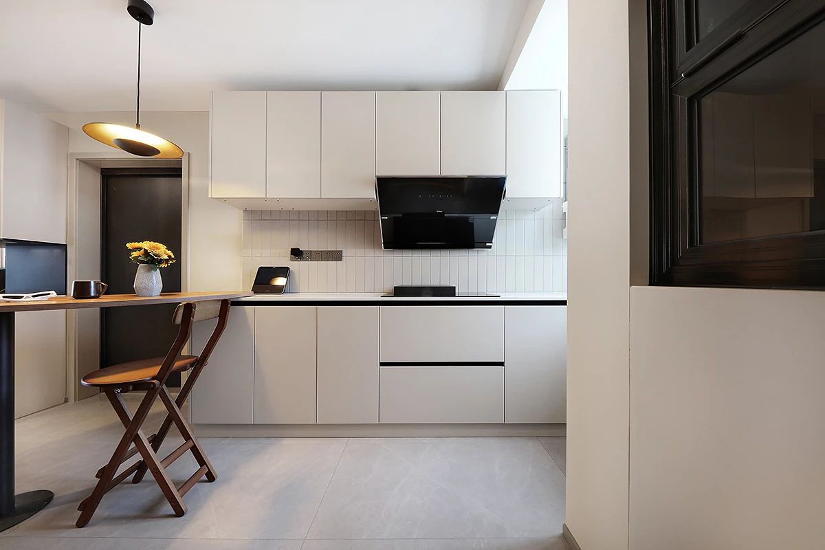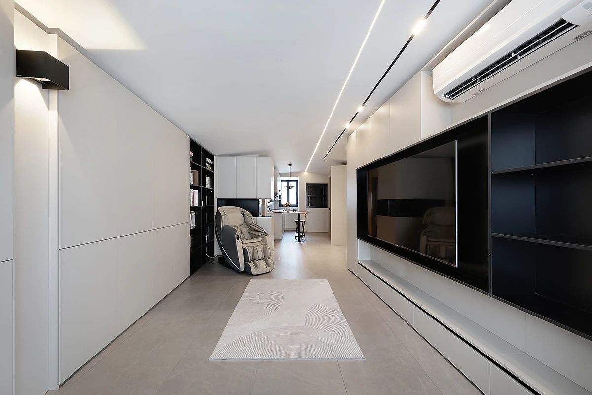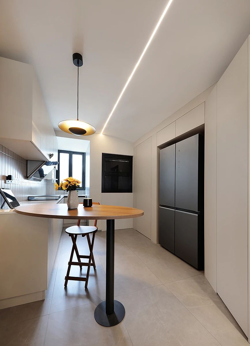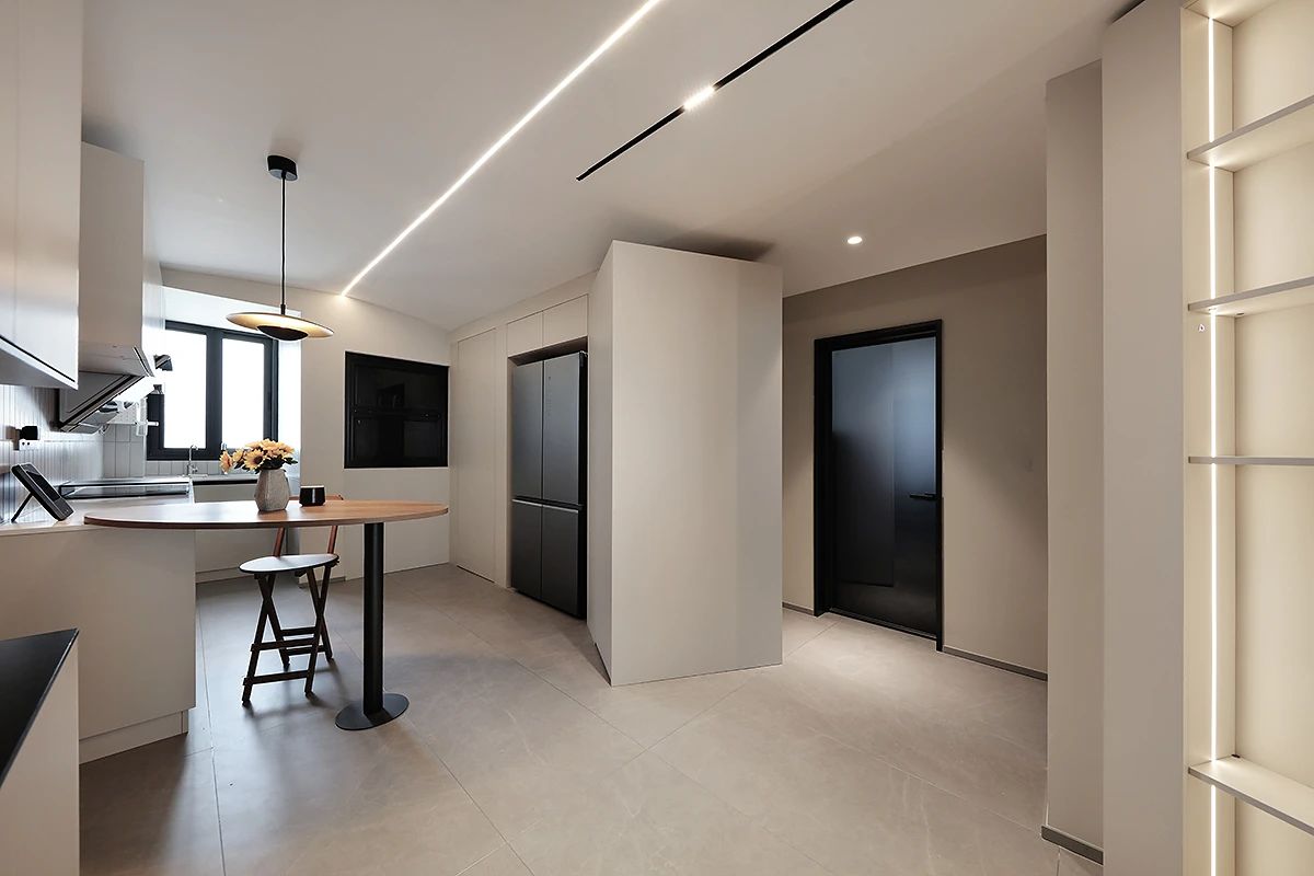 家人对居住环境的要求十分一致——整洁方便打理,空间感较大、舒适性强。空间整体强调形式服从功能,注重材料质感与色彩线条的简约性。从实用角度出发,但整体的协调与几何构造,让实用的土壤中生长出艺术之花。