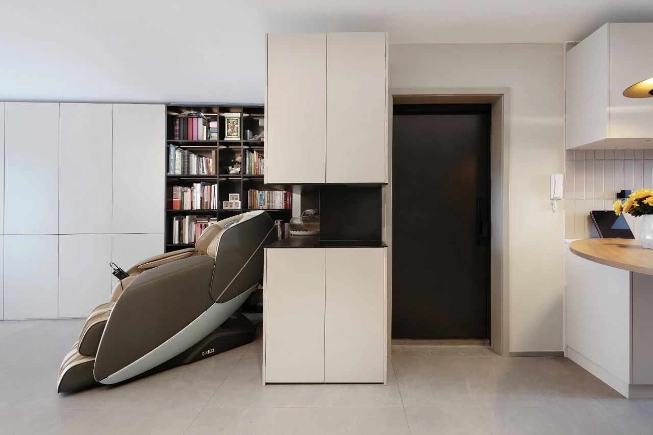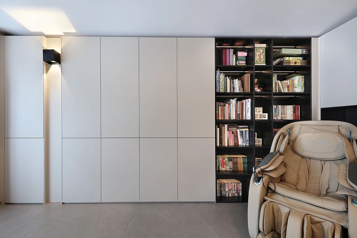 玄关柜、书柜和整面墙的储物柜形成一个统一的整体,结构型设计手法充分满足了家庭储物需求。