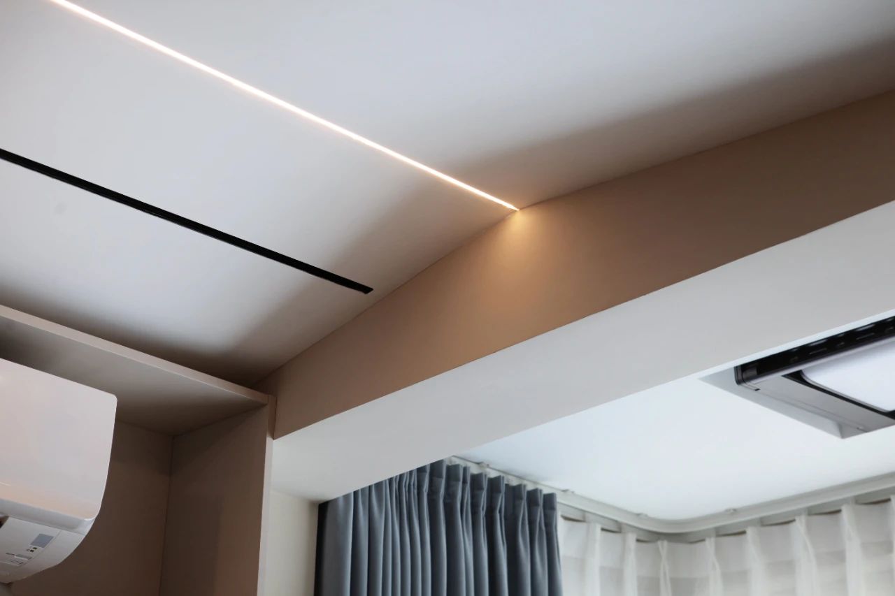 由于层高等限制,利用山型吊顶增加视觉高度及空间感,并以此固定线型灯。