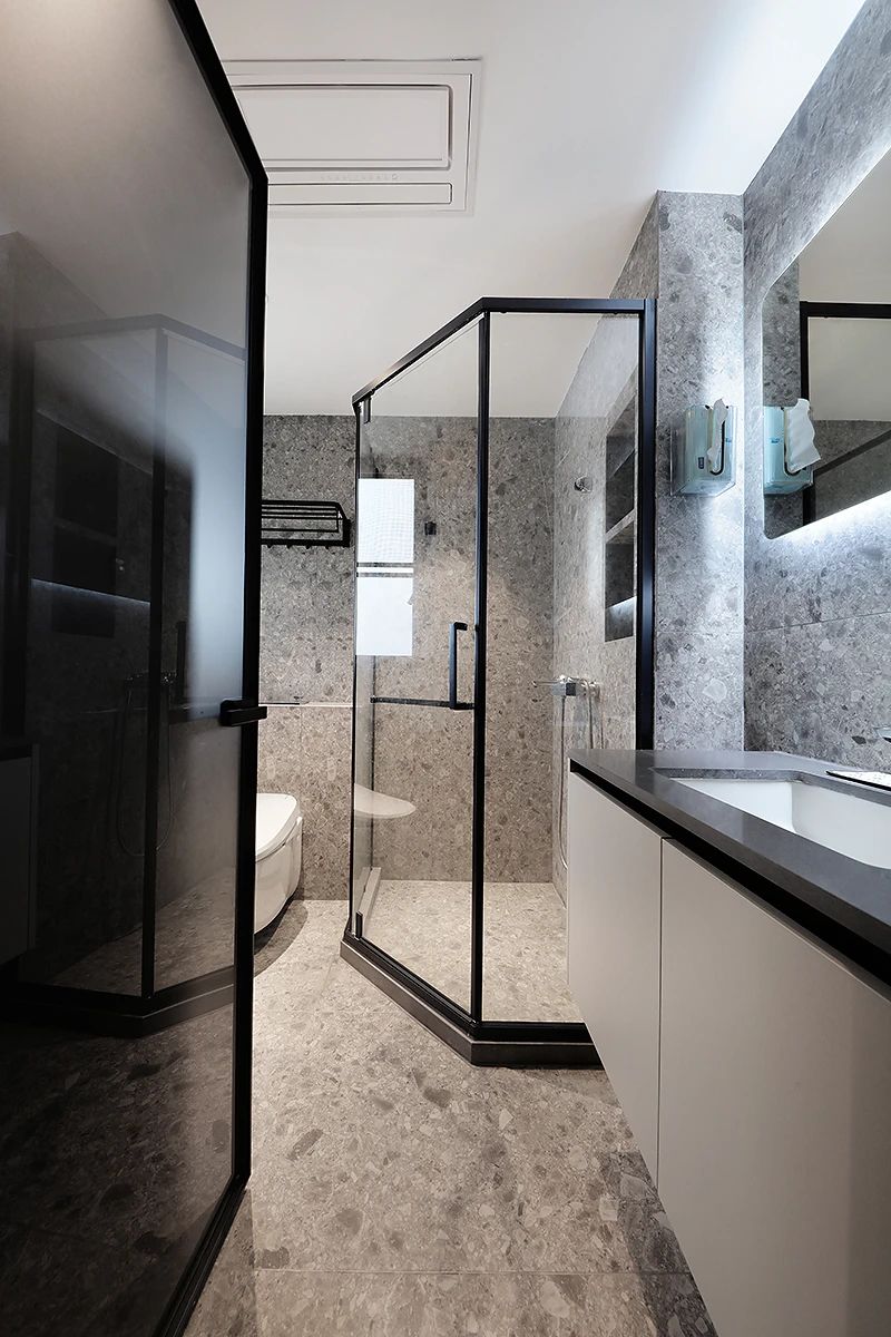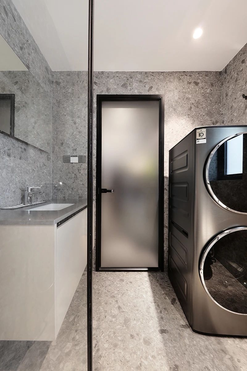 卫生间同样延用经典的黑白线条,油砂门透光不透人。