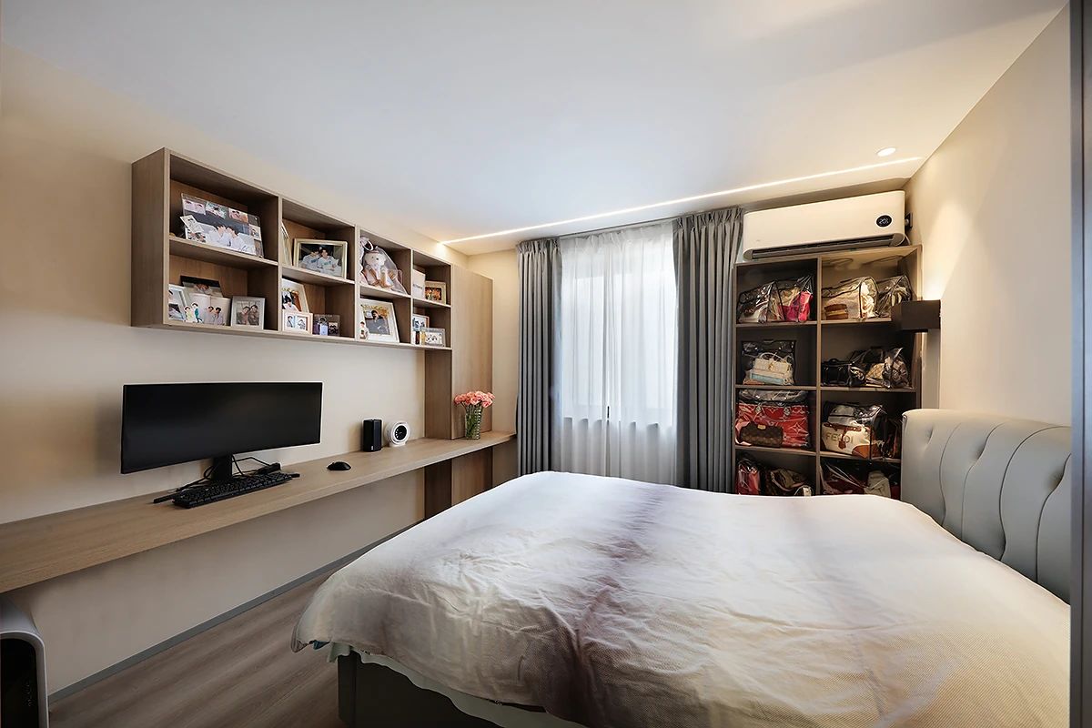 内置超大书桌供主人办公、游戏,展示柜内则摆满了主人心爱的包包与手办等。