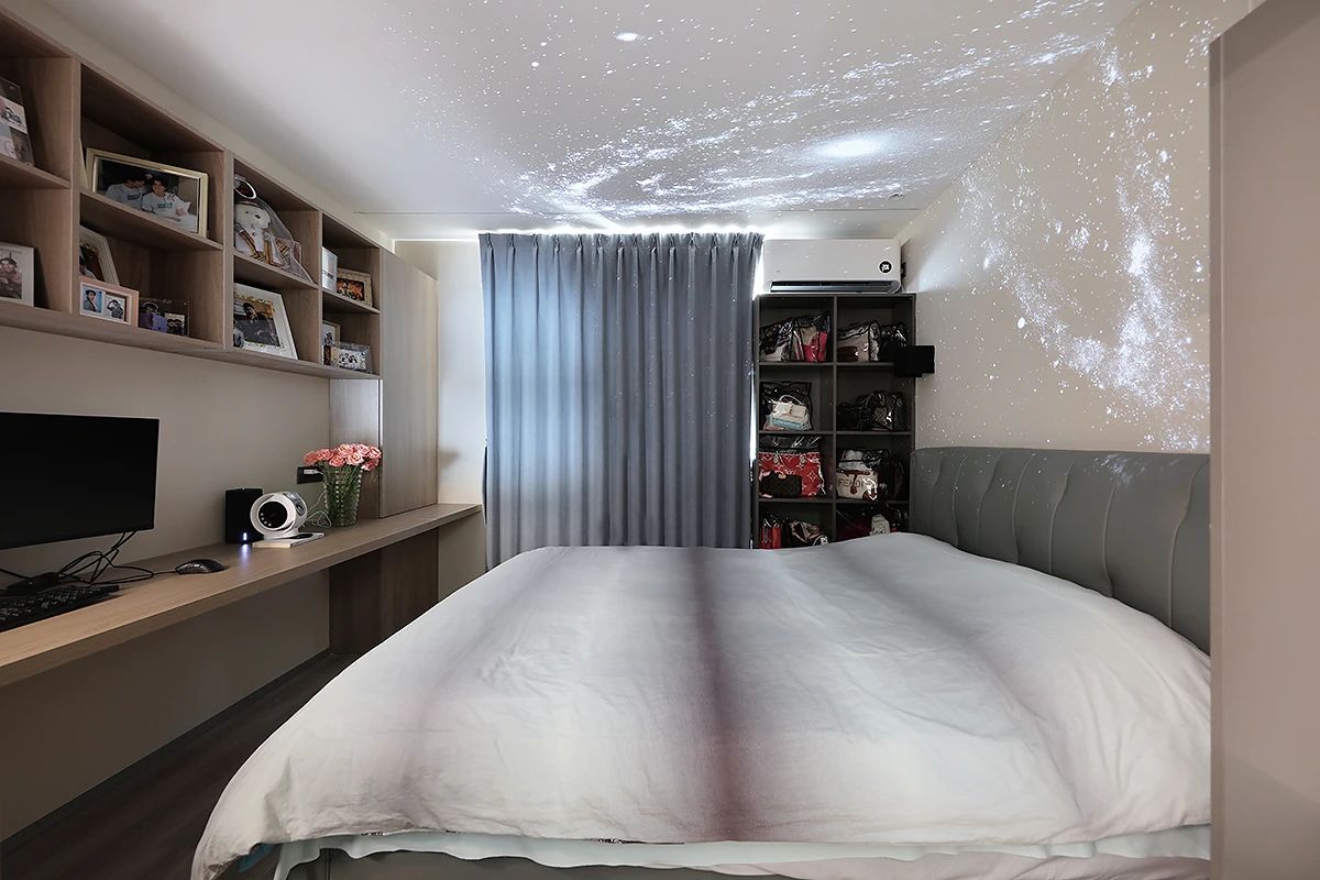女儿卧室房门使用隐形门,冰箱内嵌入柜体中,保持了整体的完整和谐。