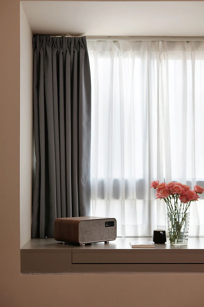 母亲爱好针织手工活,设计师利用飘窗给母亲做了一个独特的书桌,在飘窗上安装了可移动滑轨的柜体,形成推拉的桌面,桌面下方可储物。