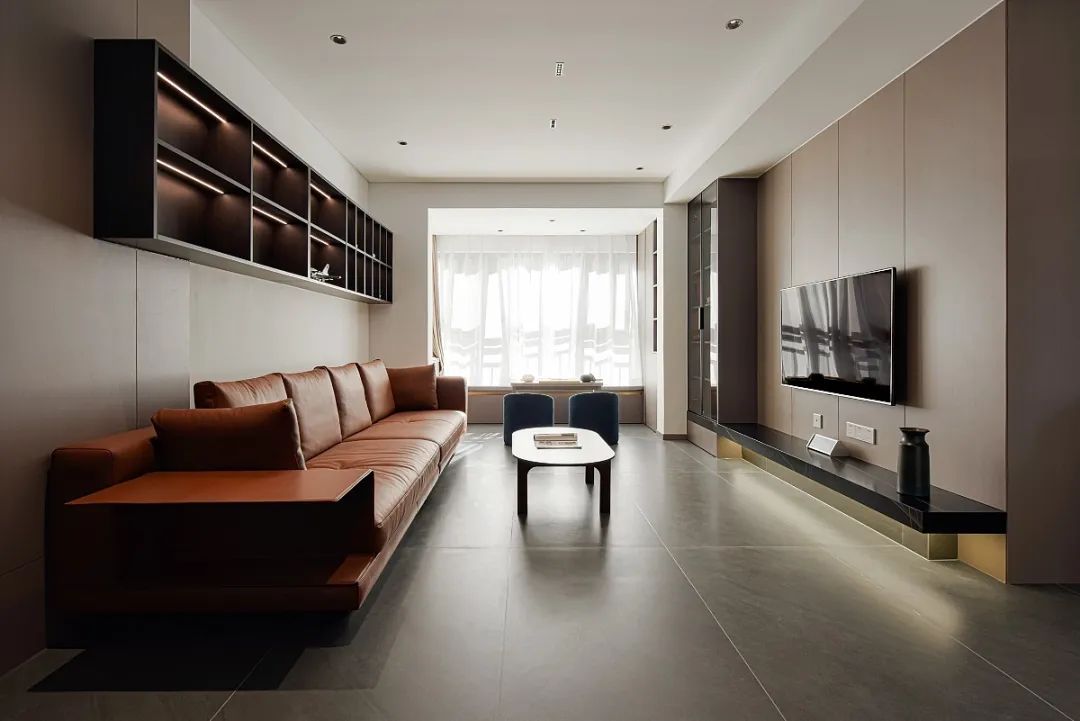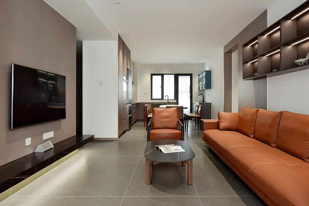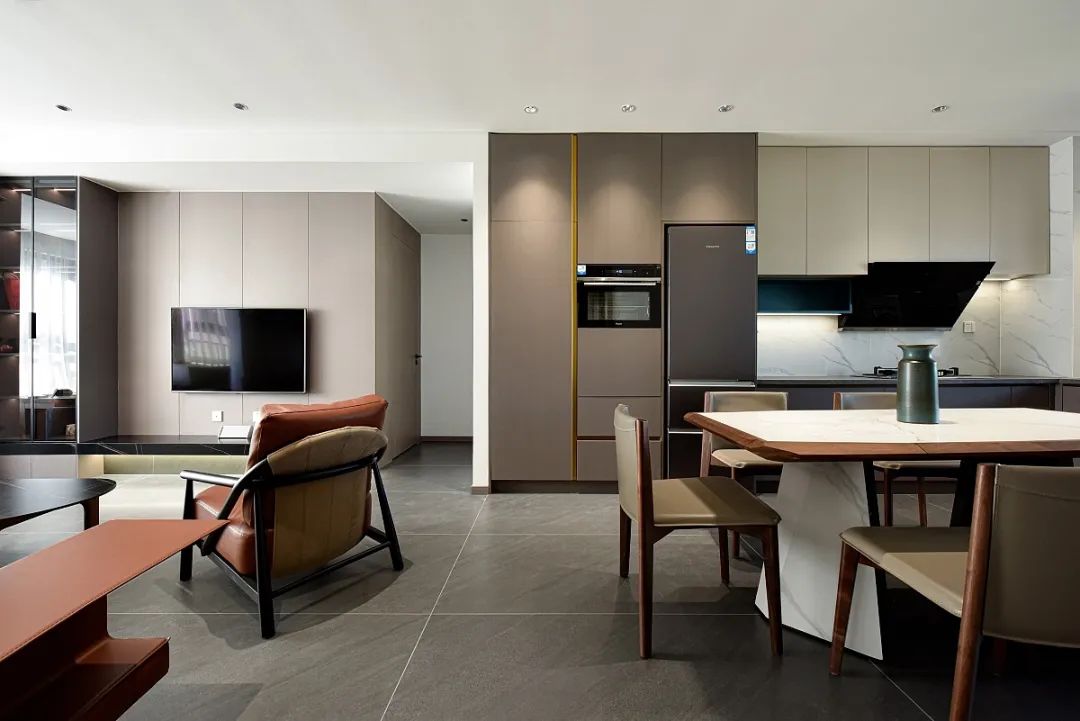 客餐厅取消了吊顶,线条更加简单干净。隐藏灯带和点光源,根据需要灵活添加,同时在橱柜、立面增加不同氛围光,丰富光线的层次感。