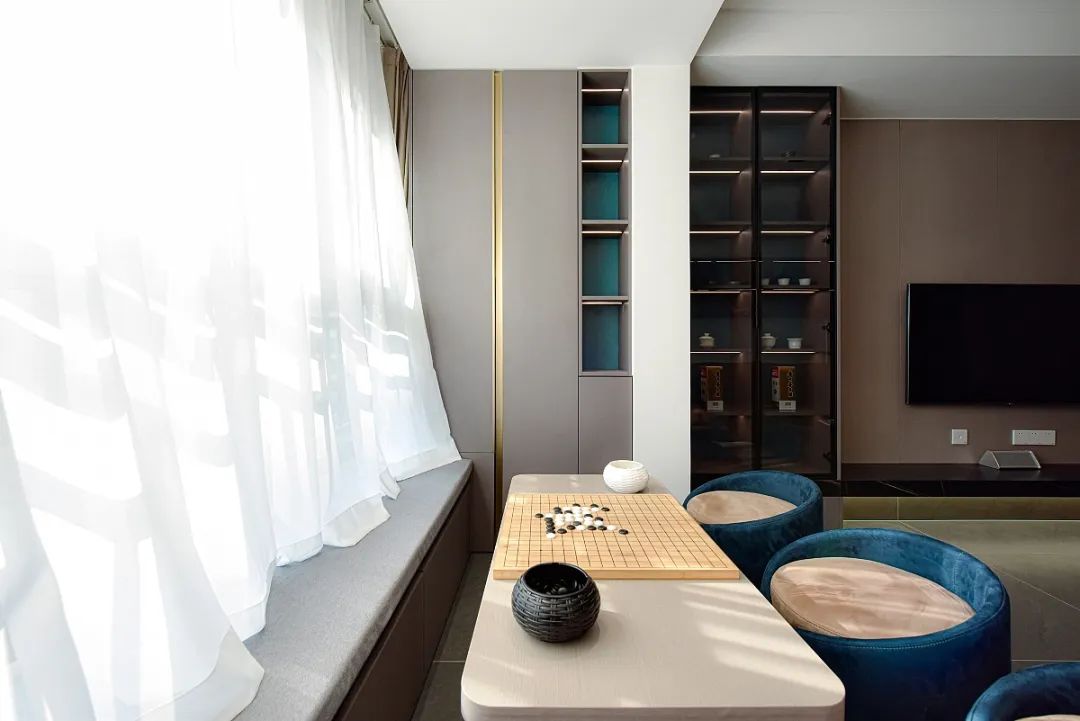 客厅封阳台做休闲区,在客厅一角。茶台上摆一套精致禅意的茶具,或者和家人朋友下下棋,都是很不错的生活享受。