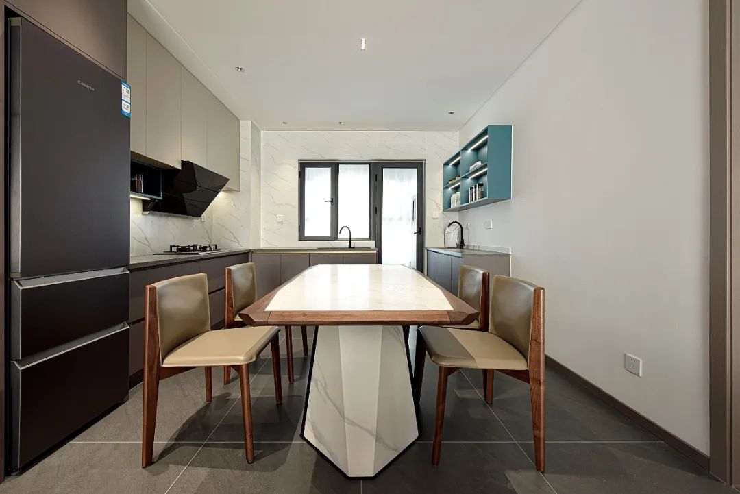 餐厅顶部的灯光柔润了黑与灰的沉寂,给空间增添了几分精致感。餐厅的另一边是开放式厨房,定制了一组收纳柜,丰富了餐厅的功能,不仅可以储物,还方便饮用取水和餐前净手,提升生活的质量。