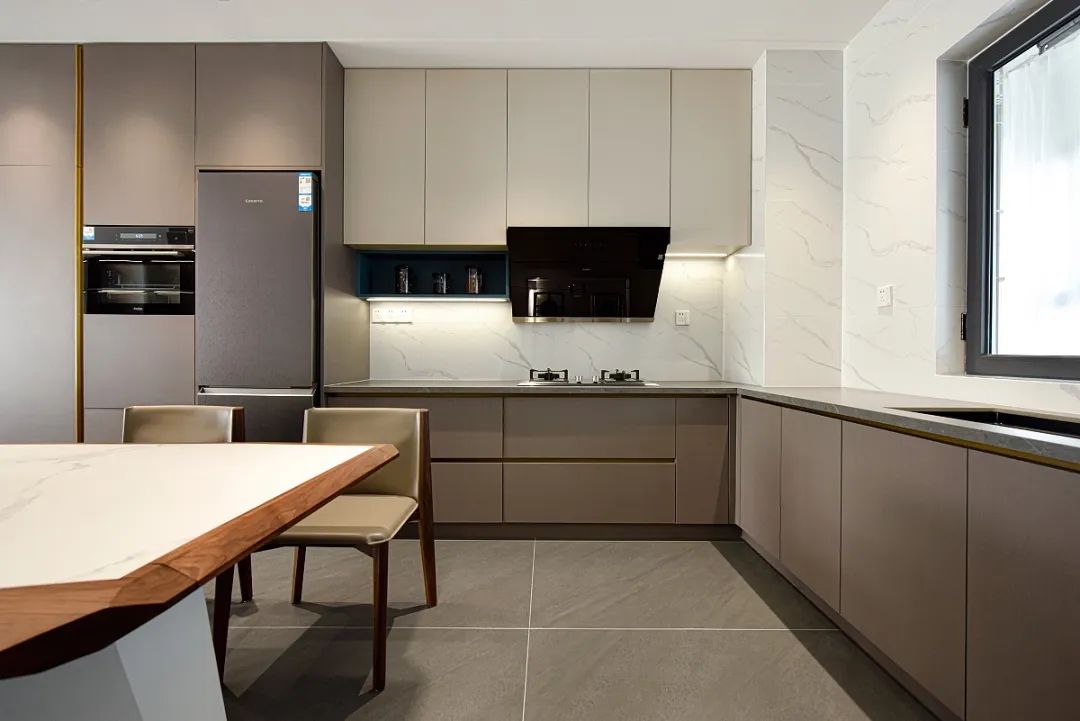 开放式厨房,做的是中西双厨一体,三餐四季,家里未来很多美味与美好都会在这里被回忆记录。厨房整体很干净清爽,下厨时,可以沉浸在从容而舒适的氛围中。