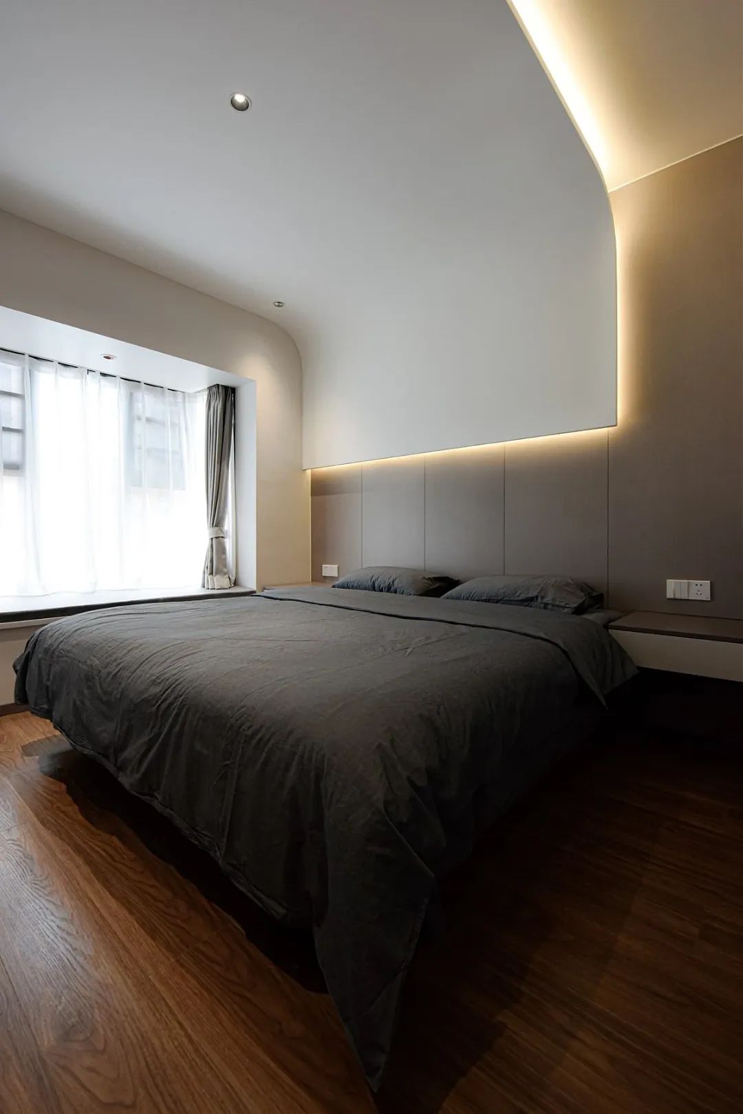 主卧延续全屋的现代风格,在色调上会偏暗沉些,流畅的线条碰撞圆润的墙饰与灯饰,细节处彰显屋主对生活的追求与享受。