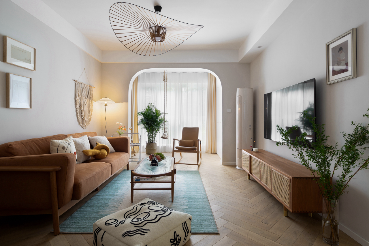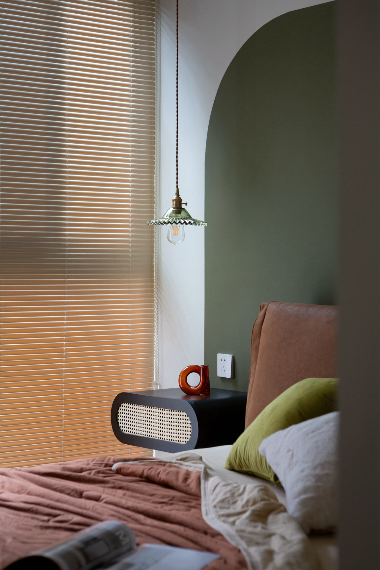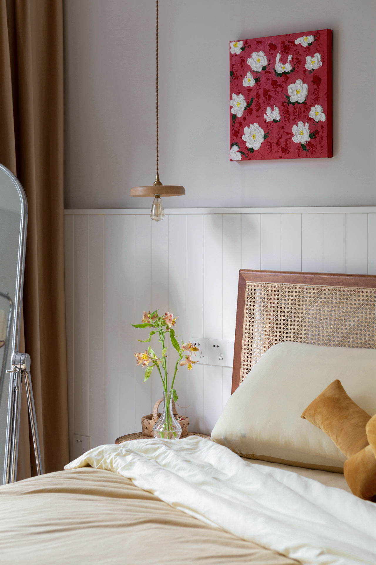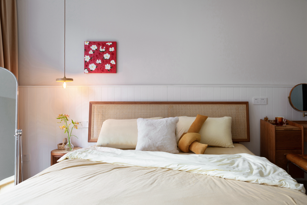 主卧背景墙的木头材质营造出的氛围能够带来安全感,配以藤编材质的床、柔软的布艺、温馨的吊灯,共同糅杂散发出度假般的惬意感受。