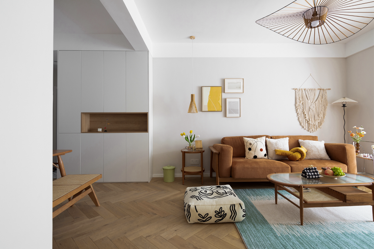 以自然感的奶茶色系墙面为基调,配以色度不同的原木材质作为点缀。用空间作为媒介,反馈出屋主自由且随意的生活方式。