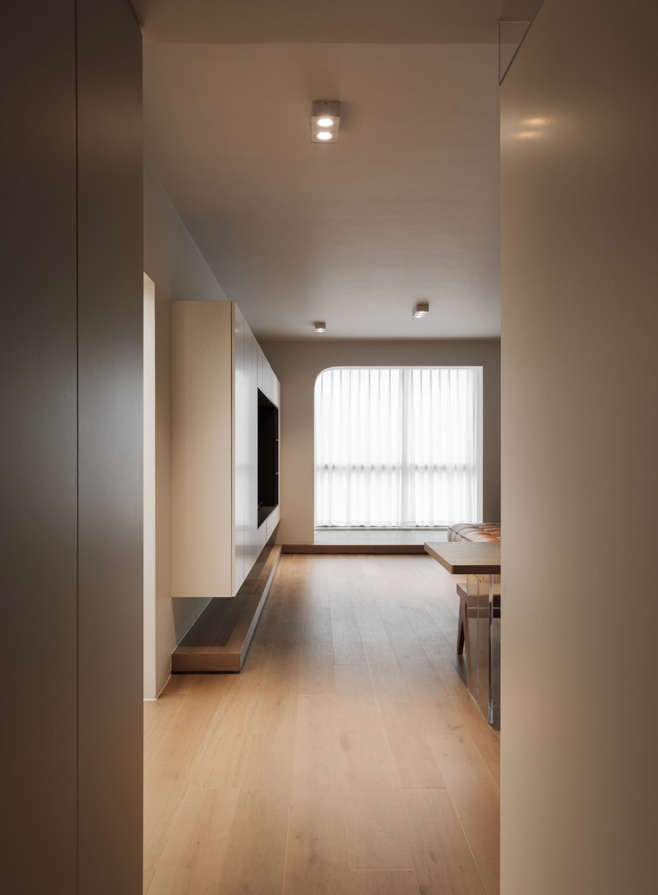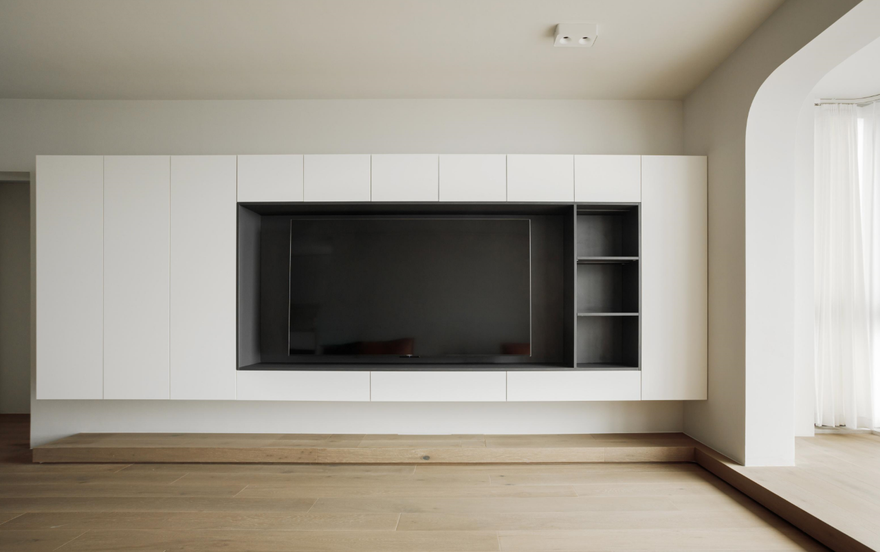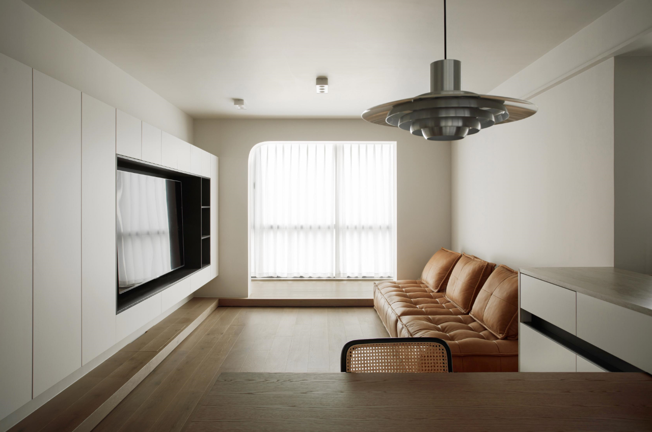客厅删繁就简,尽可能保留层高与活动区域,光影流动中家人的陪伴成为浓厚情感的支持。地台从阳台区域延伸至电视背景墙,摆放物品、隐藏收纳的同时也丰富了空间层次。