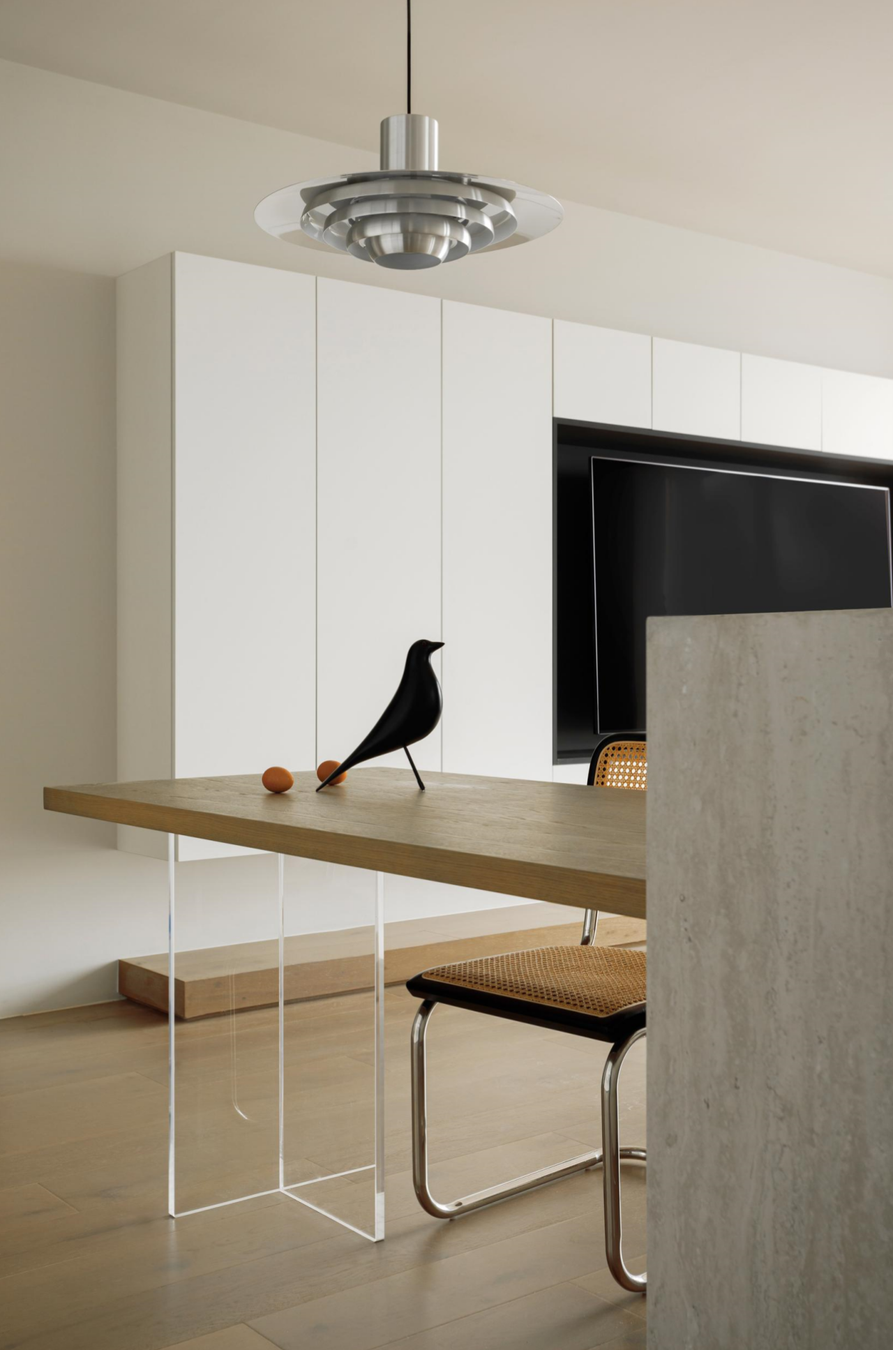 餐桌由岛台延伸而来,多变的摆放形式可满足4-6人就餐,餐厅还可作为办公和娱乐活动区,具有多样的社交属性。